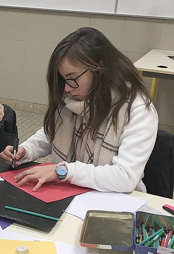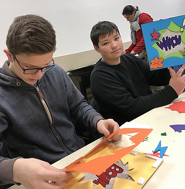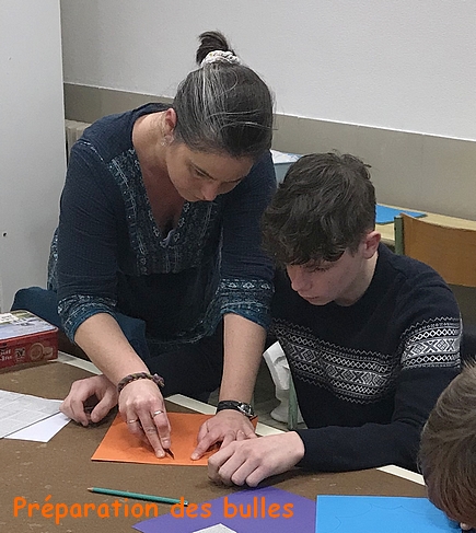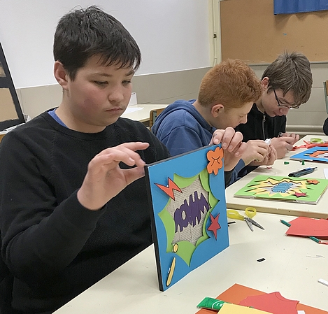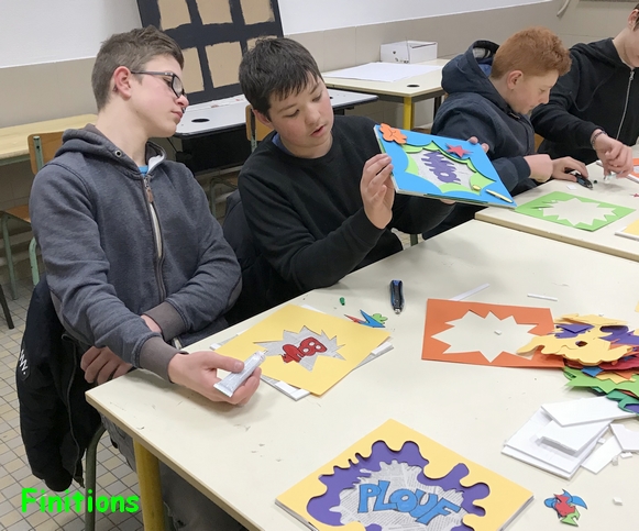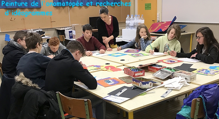 En quatre étapes, ils ont réalisé un panneau représentant neuf onomatopées de leur choix, dans deux bulles superposées, accompagnées d’idéogrammes, le tout en relief.