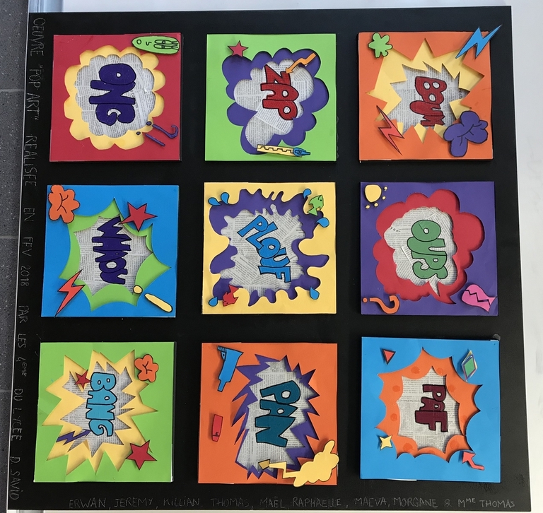 Dans le cadre des enseignements pratiques interdisciplinaires, les élèves de 4ème à projet professionnel ont réalisé une œuvre commune qui s’inscrit dans le mouvement artistique du pop art. Ils ont été accompagnés dans ce projet par Mme Agnès THOMAS, leur professeur principal, et Madame BENEAT, intervenante en arts plastiques.