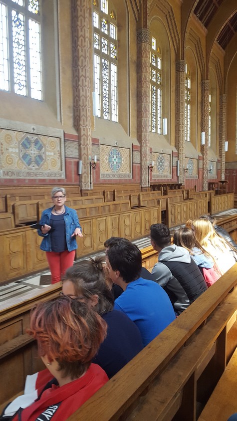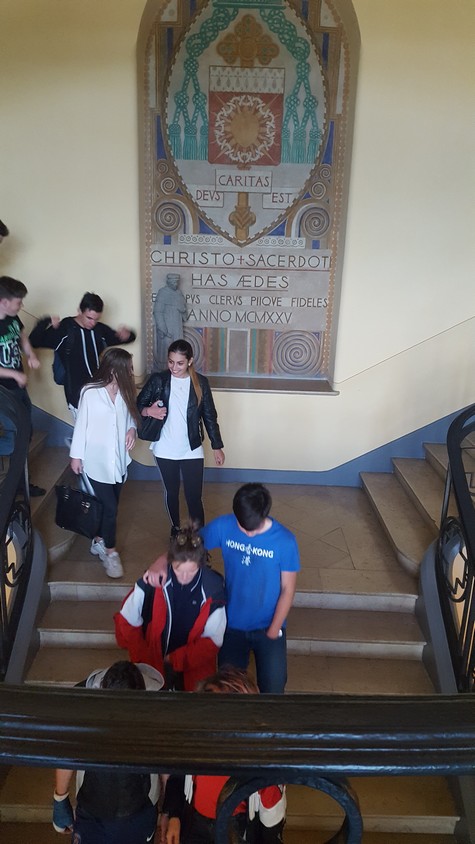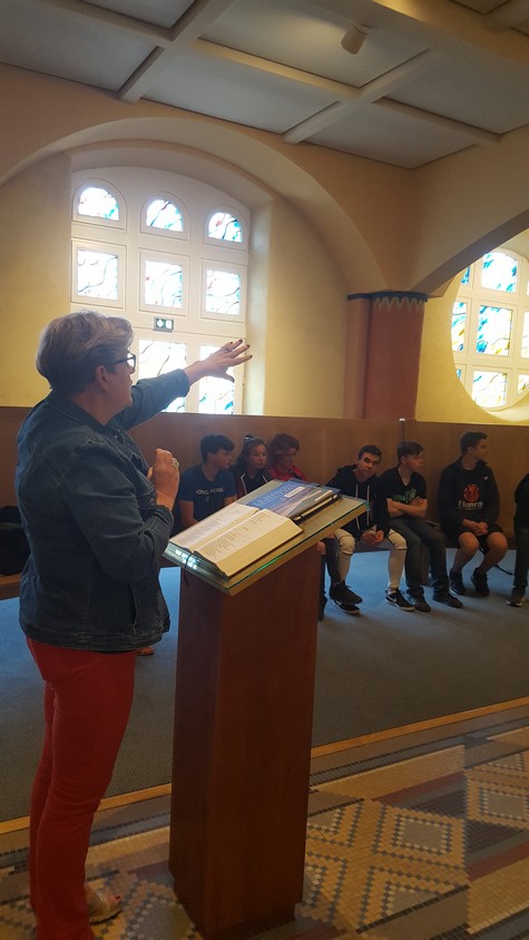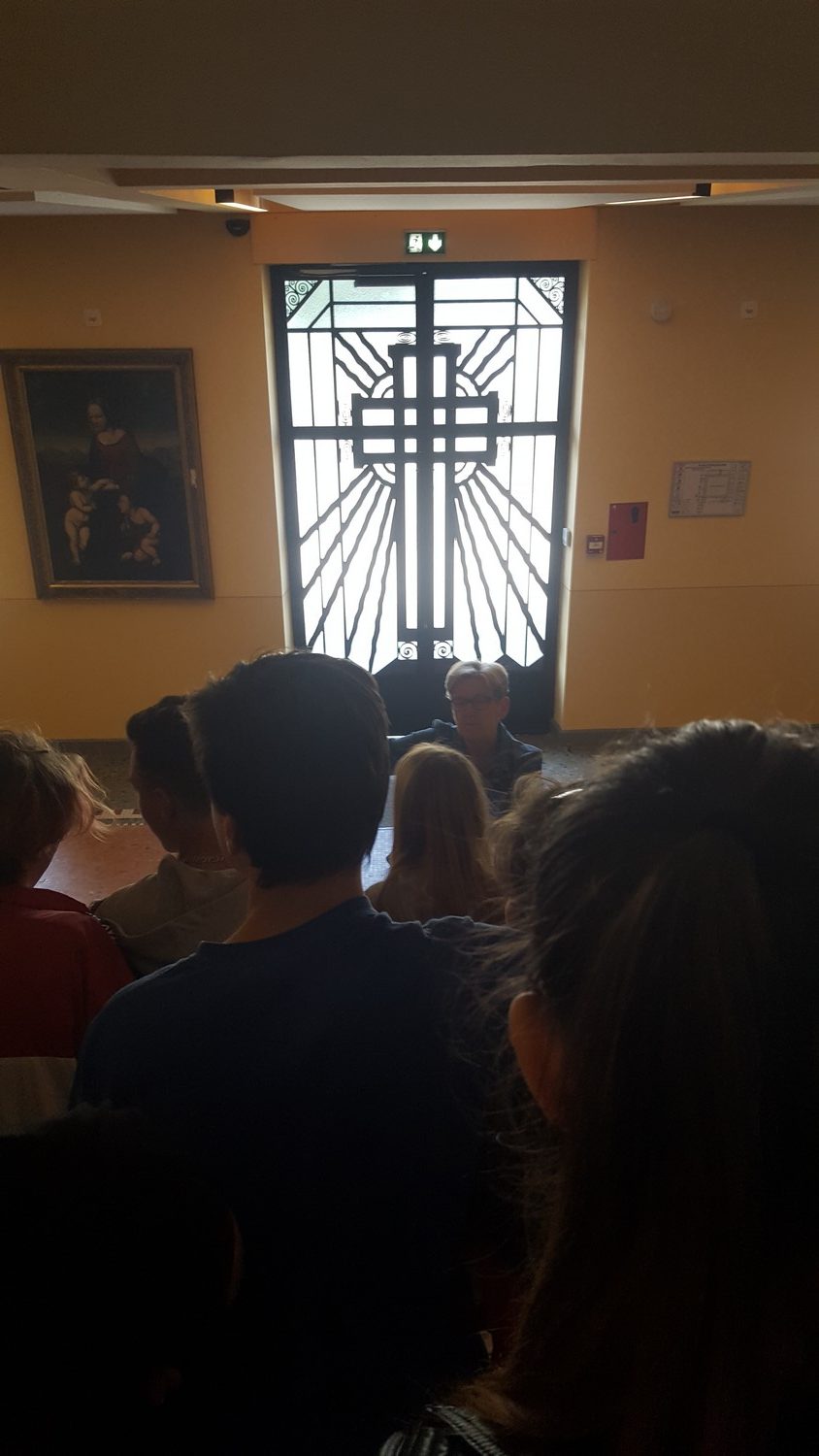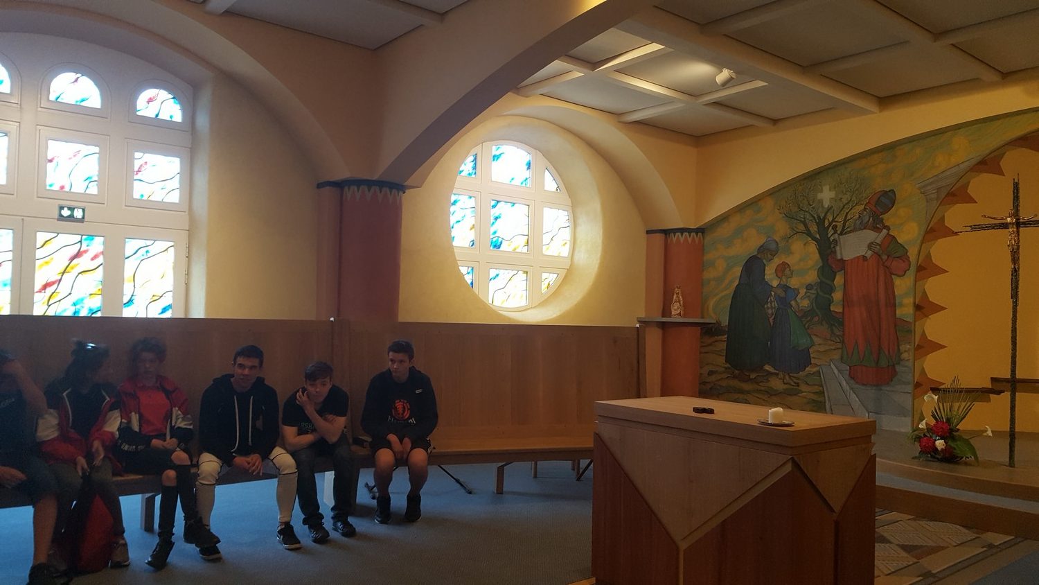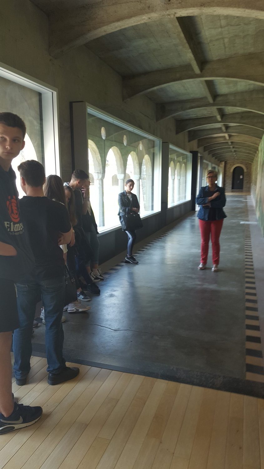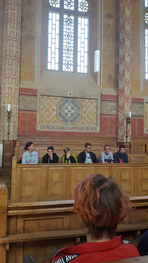 Après avoir pique-niqué sur les grèves de Langueux, nous avons pris la direction de la Maison Saint-Yves. Nous avons été accueillis par Mme CHERDO, responsable d’animation. Elle nous a fait découvrir le cloître à la structure en béton typique du début du XXème siècle qui abrite une magnifique fresque, la chapelle au style art déco avec des mosaïques d’Odorico ainsi que sa crypte. Les élèves ont également été impressionnés par le passage à la médiathèque où ils ont admiré des livres très anciens.