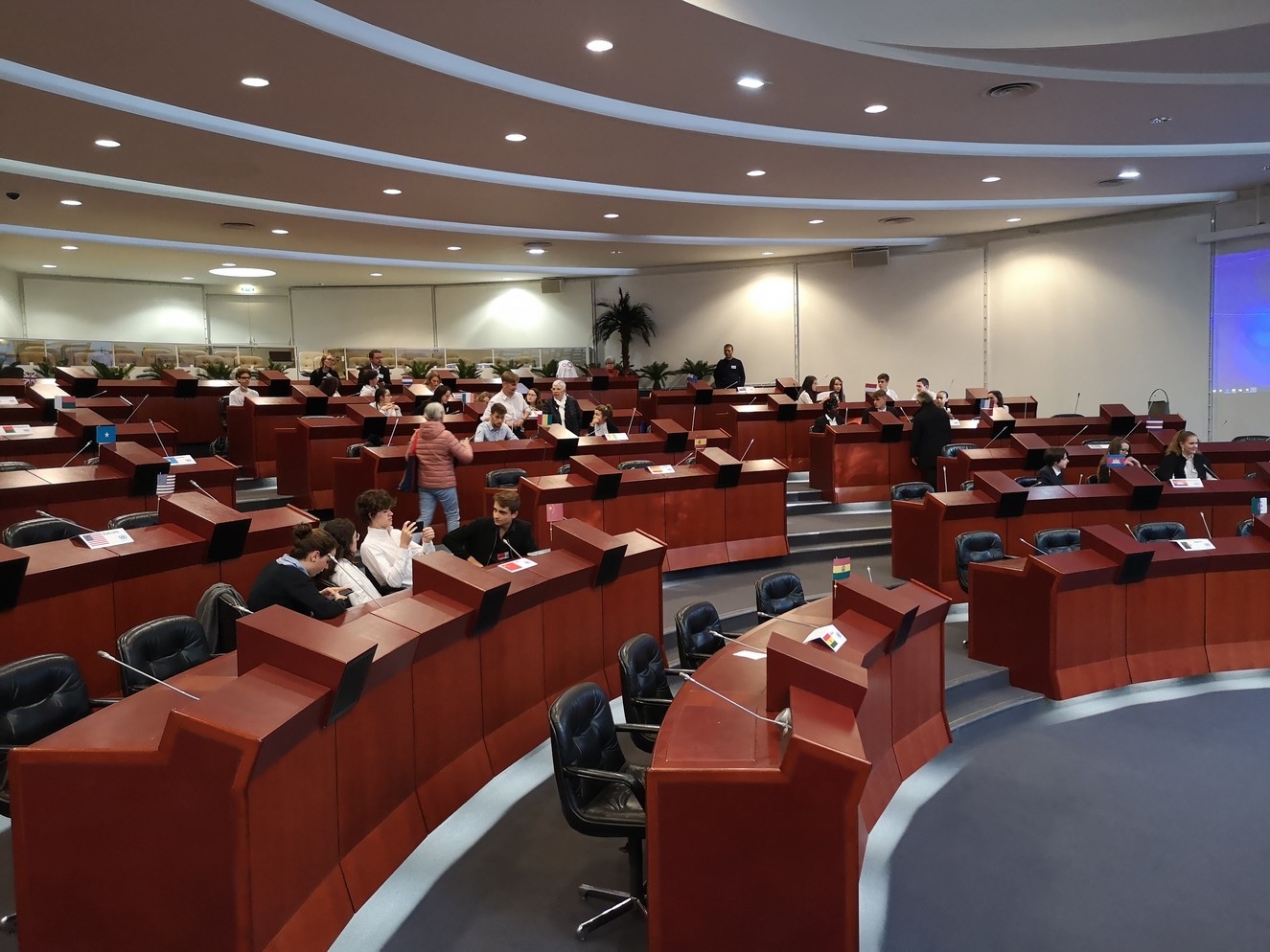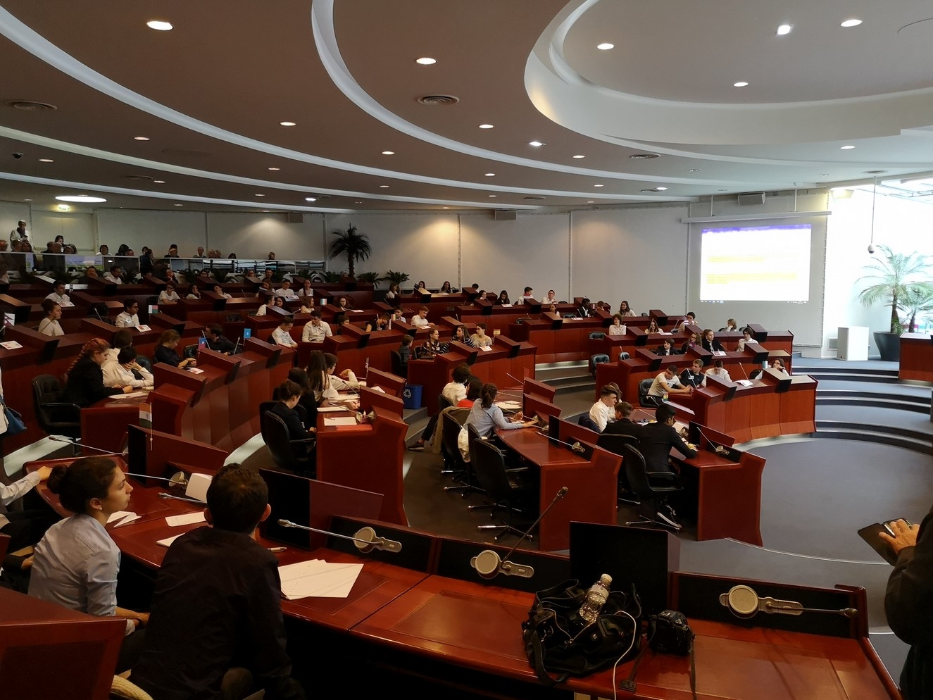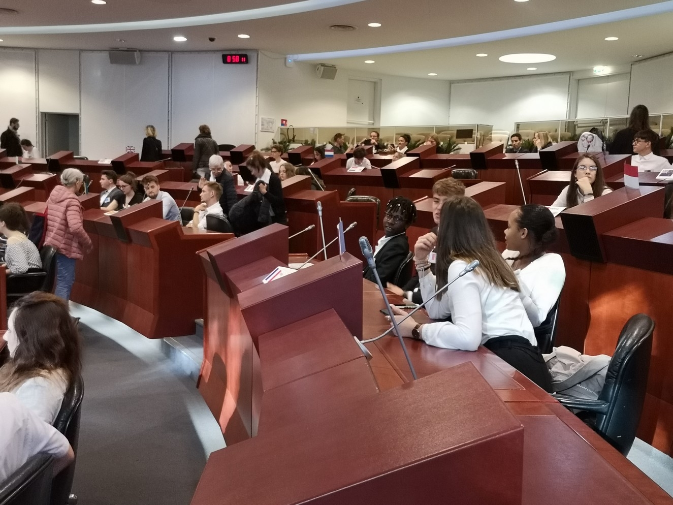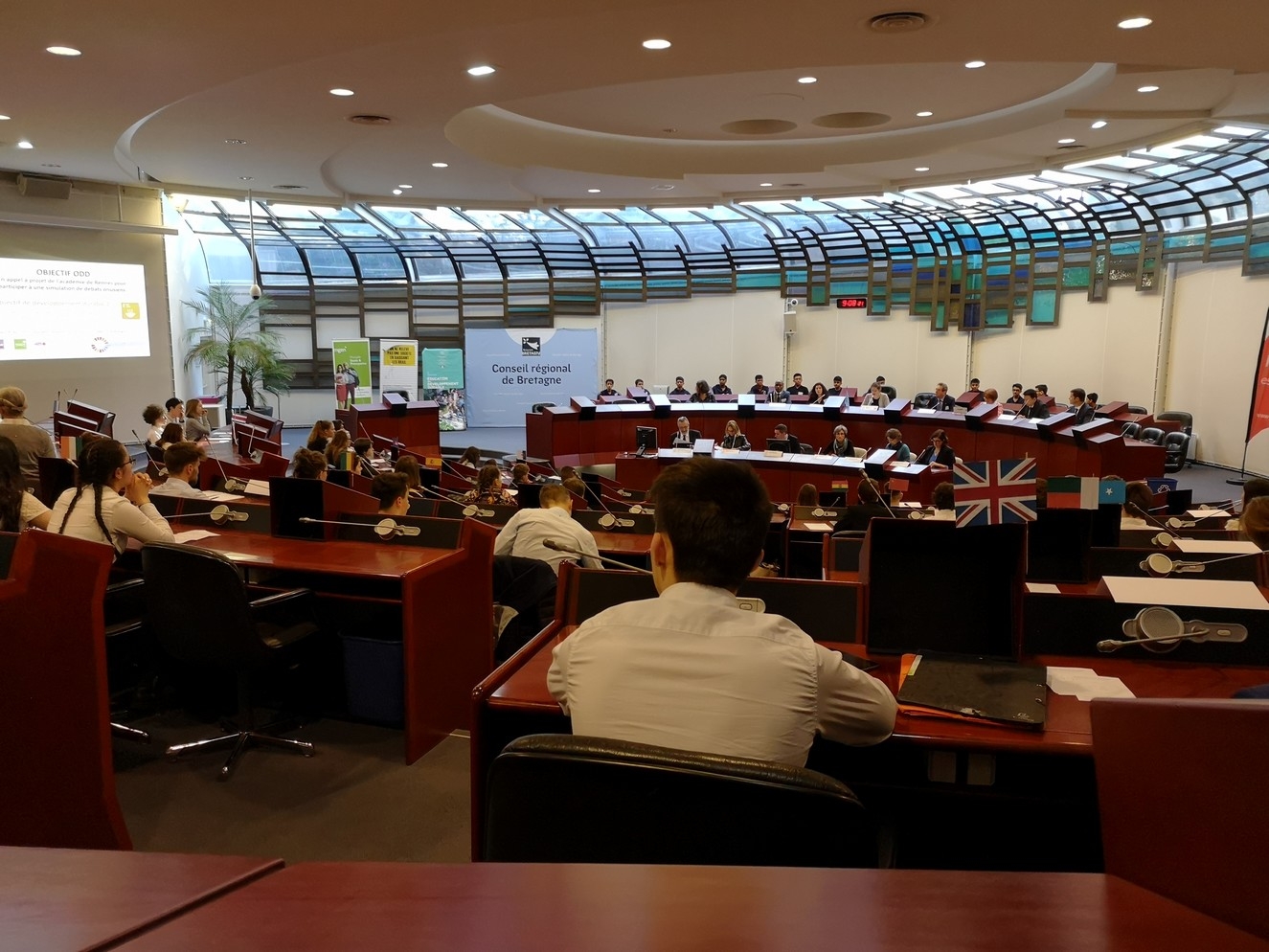 « Elle a débuté à 7h17, place Duclos où nous avons pris le bus pour nous rendre à Rennes. La séance préliminaire a débuté à 9h par les discours des différents personnalités présentes dans l’hémicycle puis par l’examen des différentes résolutions des dix-neuf états représentés. C’est Charles qui est allé présenter à la tribune les résolutions de la France. Les négociations entre les états ont ensuite débuté. Les délégations sont alors réparties dans trois salles afin de réfléchir, se mettre d’accord et aboutir à de nouveaux projets de résolutions. Il y avait dix-neuf projets au départ, il n’en restera plus que trois qui seront à nouveau présentés dans l’hémicycle. Après ces premiers débats, nous sommes partis nous restaurer au restaurant universitaire de la rue de Fougères. Les négociations suivantes ont débuté à 13h30. L’objectif de cette journée était d’obtenir un consensus et une seule résolution de la part de toutes les délégations. Après d’âpres débats durant lesquels Chloé, Enora, Charles et Jules ont été très actifs, un projet de résolution a été adopté à l’unanimité ! La journée s’est clôturée par quelques discours et félicitations à tous les élèves pour leur investissement et leur attitude durant cette journée. »