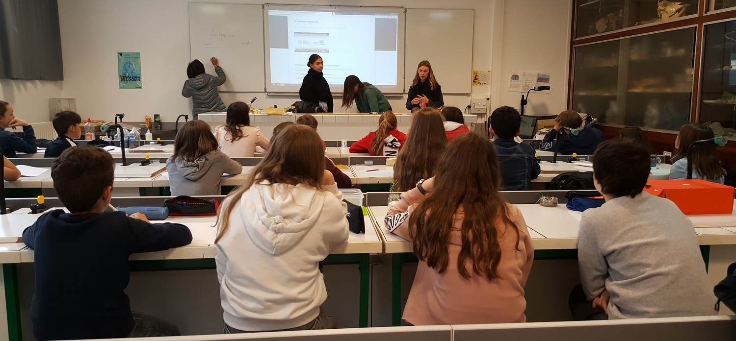 Le mercredi 24 avril, trois lycéennes de la série STMG sont venues présenter en présence de leur enseignante, Madame Coconnier, l’économie circulaire, aux élèves de sixième F sur le site de Notre Dame de la Victoire. La classe de sixième F est la classe à « projet jardin ». Ils travaillent autour du thème du développement durable dans plusieurs disciplines.