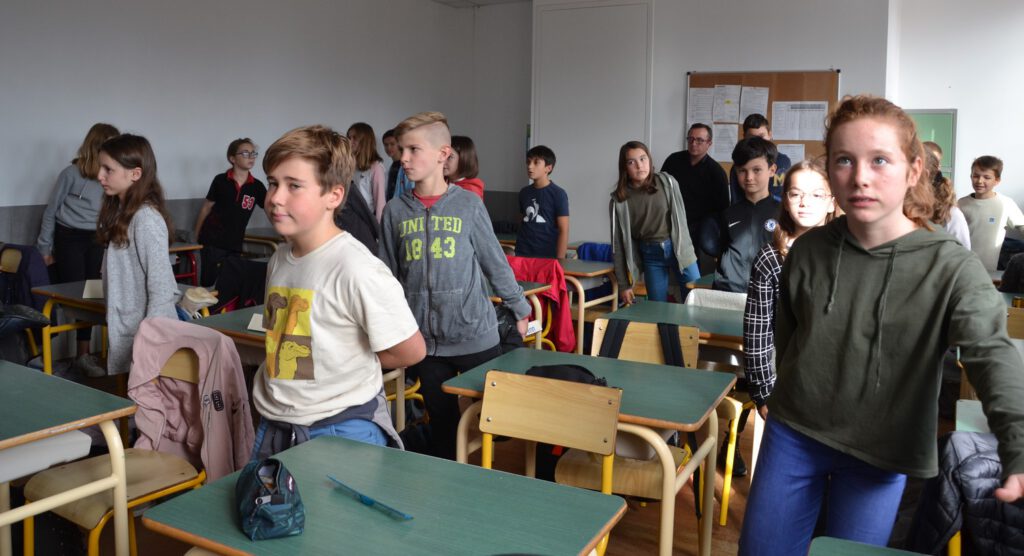 Après une 1ère séance en classe pour se mettre en projet, tous les élèves de 6ème ont vécu deux séances en salle de sport pour vivre des postures d’équilibre nécessitant une concentration totale. Lorsque l’intervenante, Florence Raguenez, leur demande ce qu’ils ressentent lorsqu’ils en font l’expérience, certains décrivent « le vide » (plus précisément, le vide de pensées parasites), « le calme », « la sérénité », et le fait que « toutes les pensées sont sur une seule chose ». De retour en classe pour les trois dernières séances, l’objectif est de concrétiser tout cela au service des apprentissages par le biais d’exercices simples et rapides à mettre en œuvre.