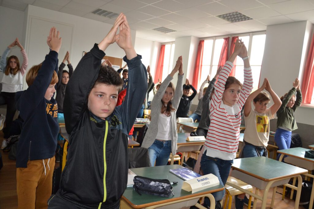 Pendant les séances 4 et 5 qui sont vécues en ce moment, les élèves comprennent qu’ils sont acteurs de leur concentration, et que celle-ci ne se gagne pas sans effort. En effet, même si les exercices sont ludiques, il est nécessaire de les réaliser avec engagement et attention. Autre point découvert par les élèves : il existe des exercices de natures différentes pour aider le cerveau à se concentrer. Les étirements permettent de relâcher les tensions ; d’autres exercices aident à se recentrer physiquement et à respirer plus paisiblement ; d’autres exercices encore guident les pensées pour faire un focus : tous constituent une « boîte à outils » qui s’enrichit au fil des séances, et dans laquelle les élèves peuvent choisir celui qui leur convient le mieux, au moment où le professeur offre quelques minutes pour cela. Un grand bravo à tous les élèves pour leur enthousiasme, leur curiosité, leur engagement dans ce travail !