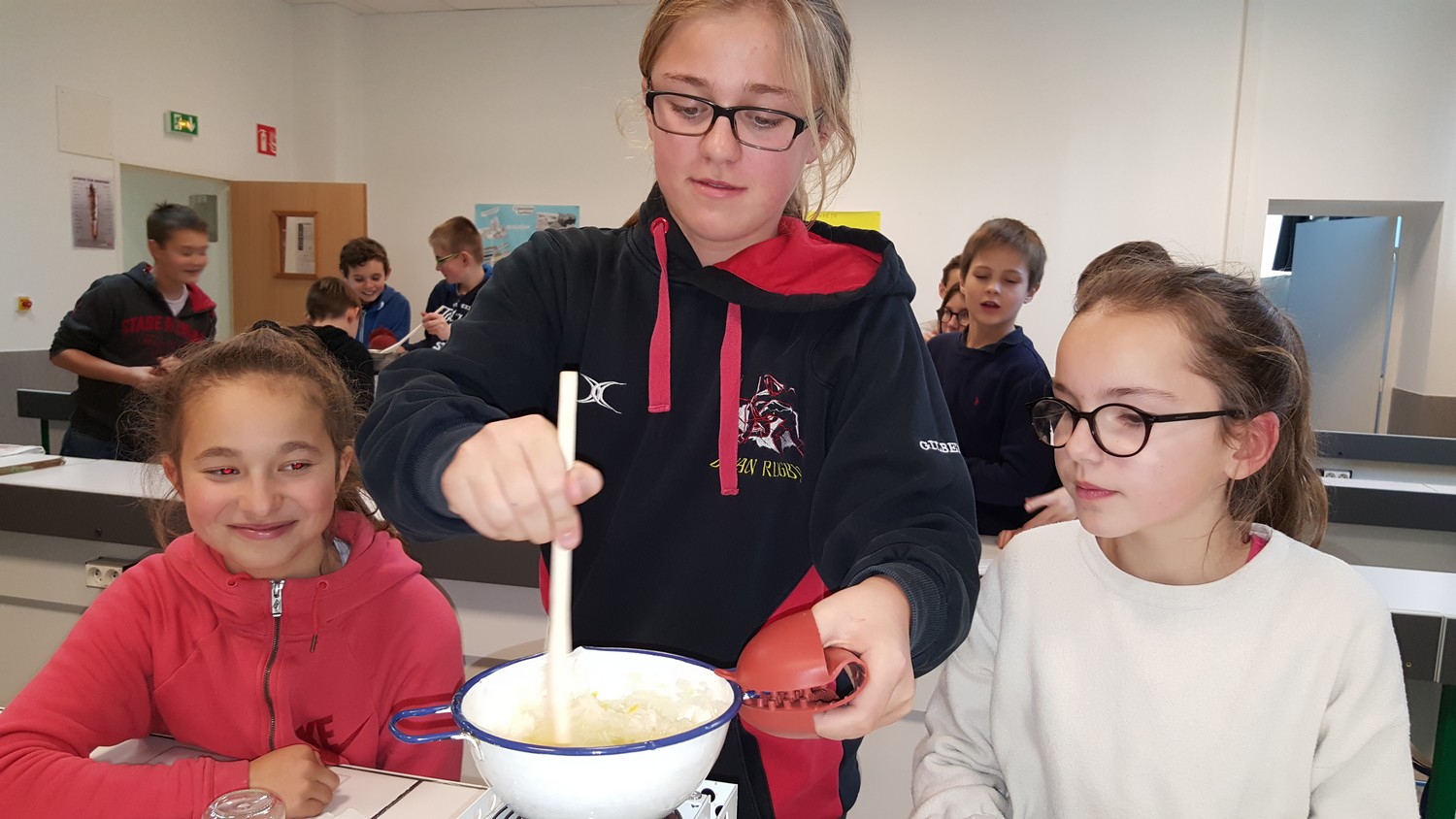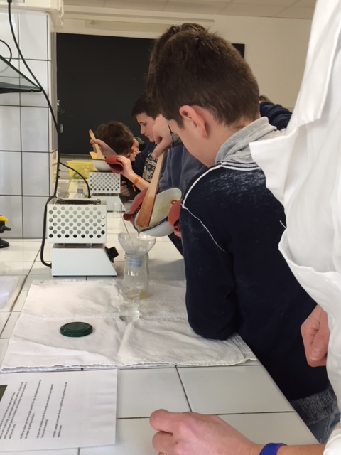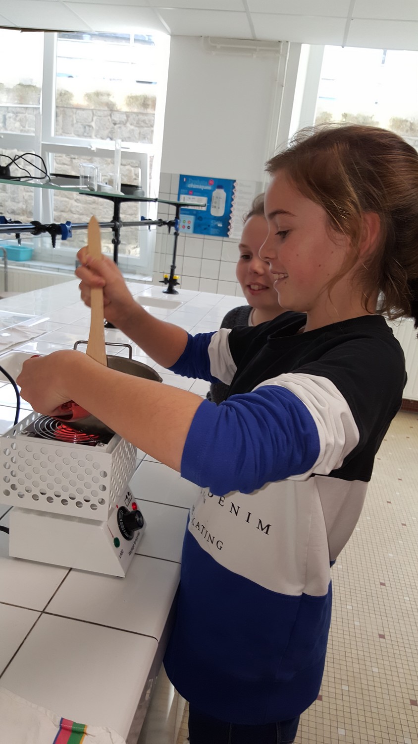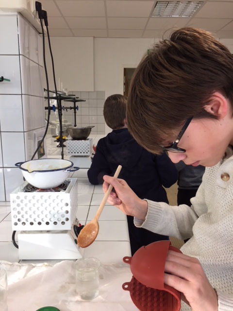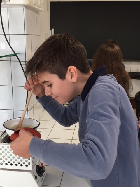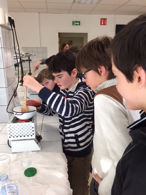 Lundi 18 décembre et mercredi 20 décembre 2017, dans le cadre du projet jardin, les élèves de sixième ont réalisé des confitures particulières sur le site de Notre Dame de la Victoire ! Afin de répondre au programme de SVT, ils ont cherché à comprendre ce qui permet la conservation des aliments. Pour répondre à ce problème, chacun a apporté sa recette de confiture préférée au laboratoire. Après avoir discuté sur les éléments indispensables à la conservation (sucre, stérilisation…) et pris les mesures d’hygiène nécessaires (désinfection des mains…), des petits groupes de deux ou trois élèves ont réalisé leur pot de confiture de melon d’eau. Cette cucurbitacée d’antan avait été semée, l’an passé dans le jardin des Cordeliers, par les élèves de cinquième actuels. Nous avons conservé des graines pour à nouveau en semer au printemps. Après avoir macéré 24 heures avec du sucre et du citron, le melon d’eau a été cuit par les cuisiniers en herbe. Les pots étiquetés du logo « projet jardin » seront vendus aux portes ouvertes pour acheter du matériel et des graines, indispensables pour jardiner…