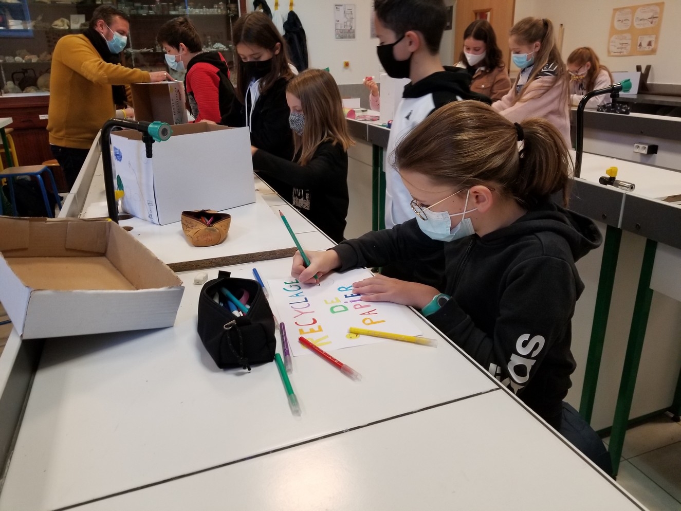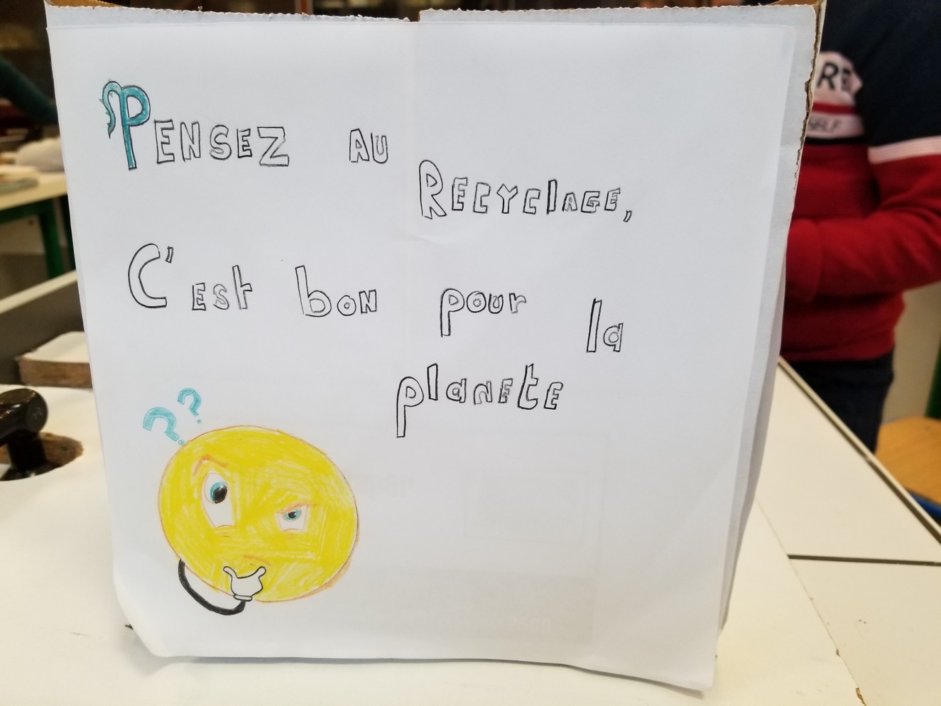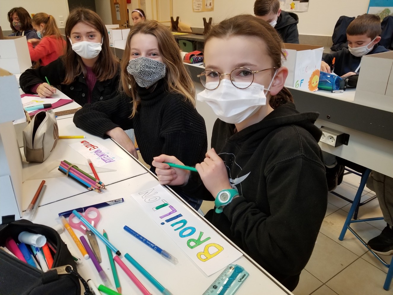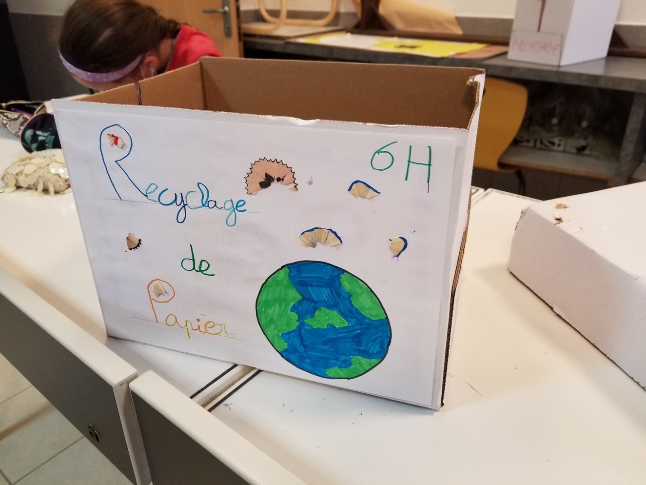 Les élèves de sixième de l'atelier "développement durable" ont décoré des boîtes vides en carton (= boîte de ramettes de papier pour photocopieuse) pour les salles de classe du collège de Notre dame de la Victoire :