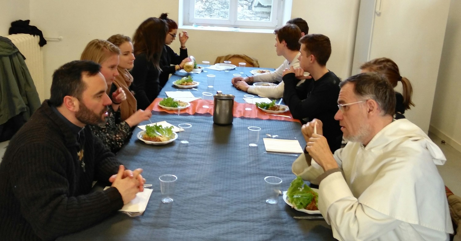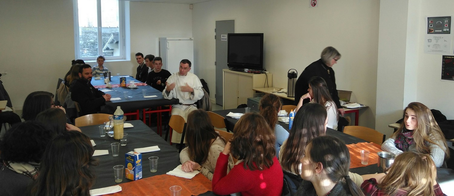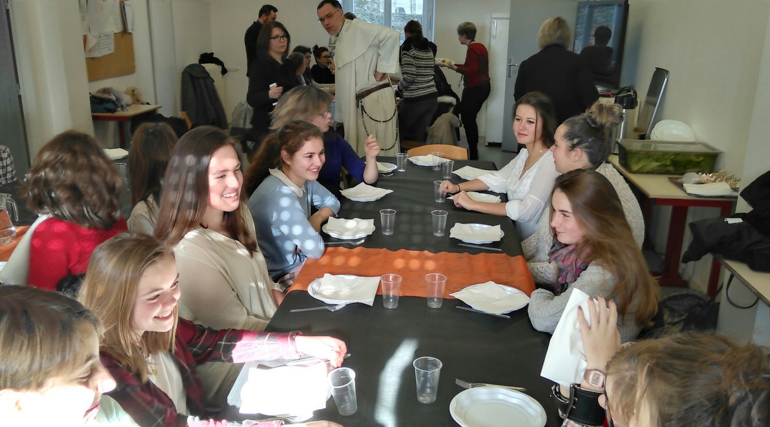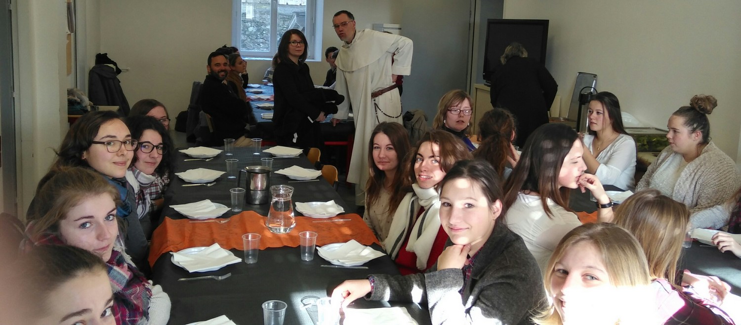 Retrouvailles des trente-et-un élèves de première présents à Lourdes comme hospitalier en octobre. Déjeuner organisé sur le site de Dominique Savio en présence entre autre du Père Guillaume et du Frère Ferrant.