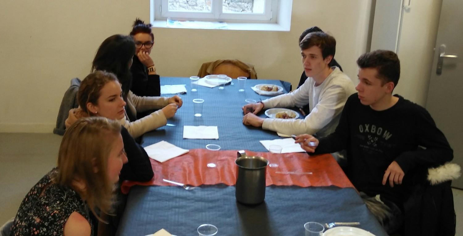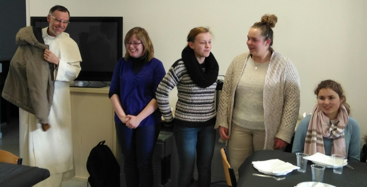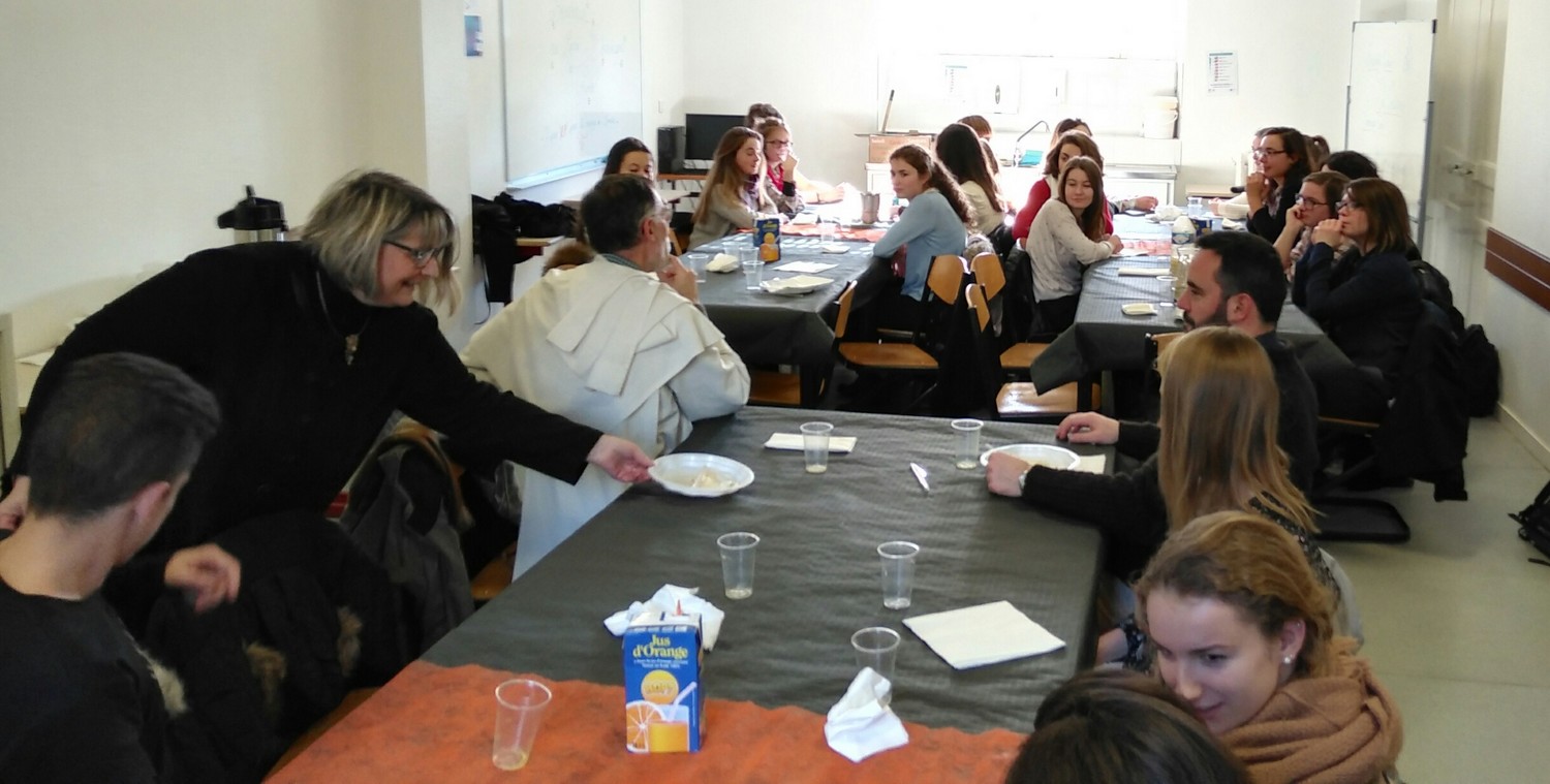 Retrouvailles des trente-et-un élèves de première présents à Lourdes comme hospitalier en octobre. Déjeuner organisé sur le site de Dominique Savio en présence entre autre du Père Guillaume et du Frère Ferrant.