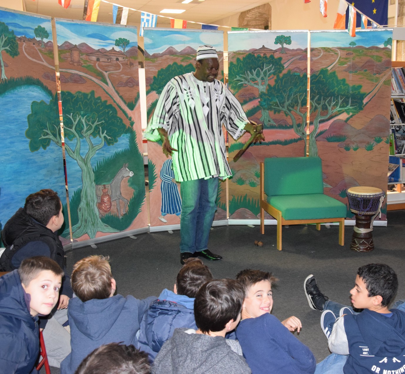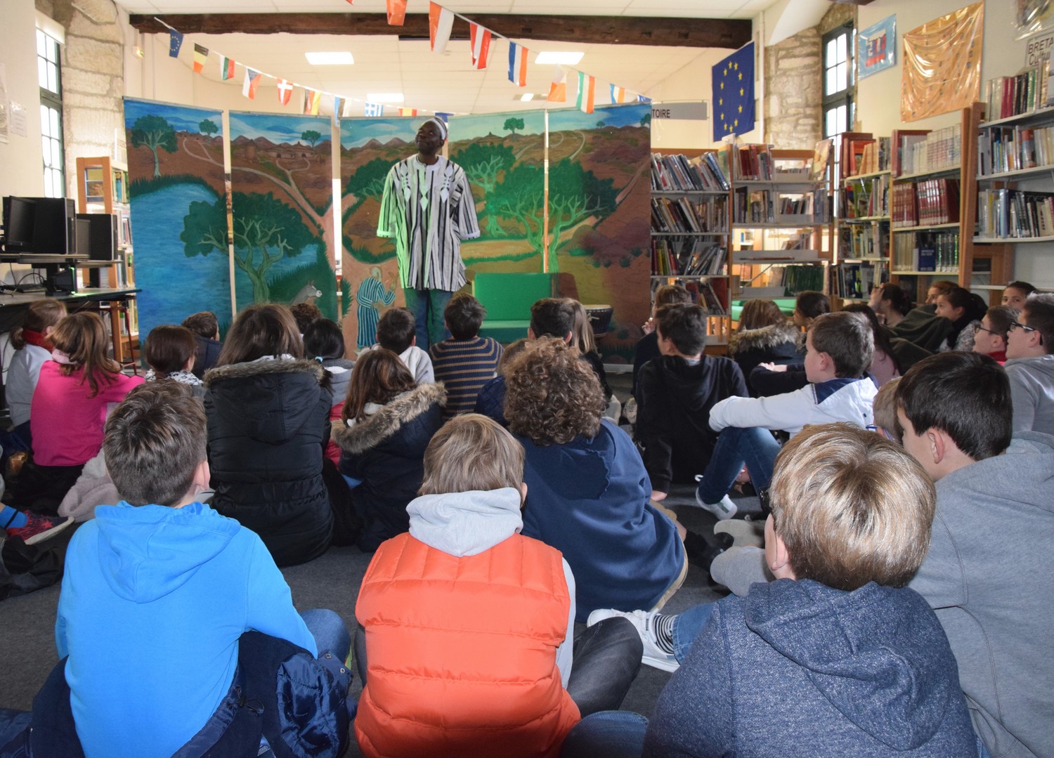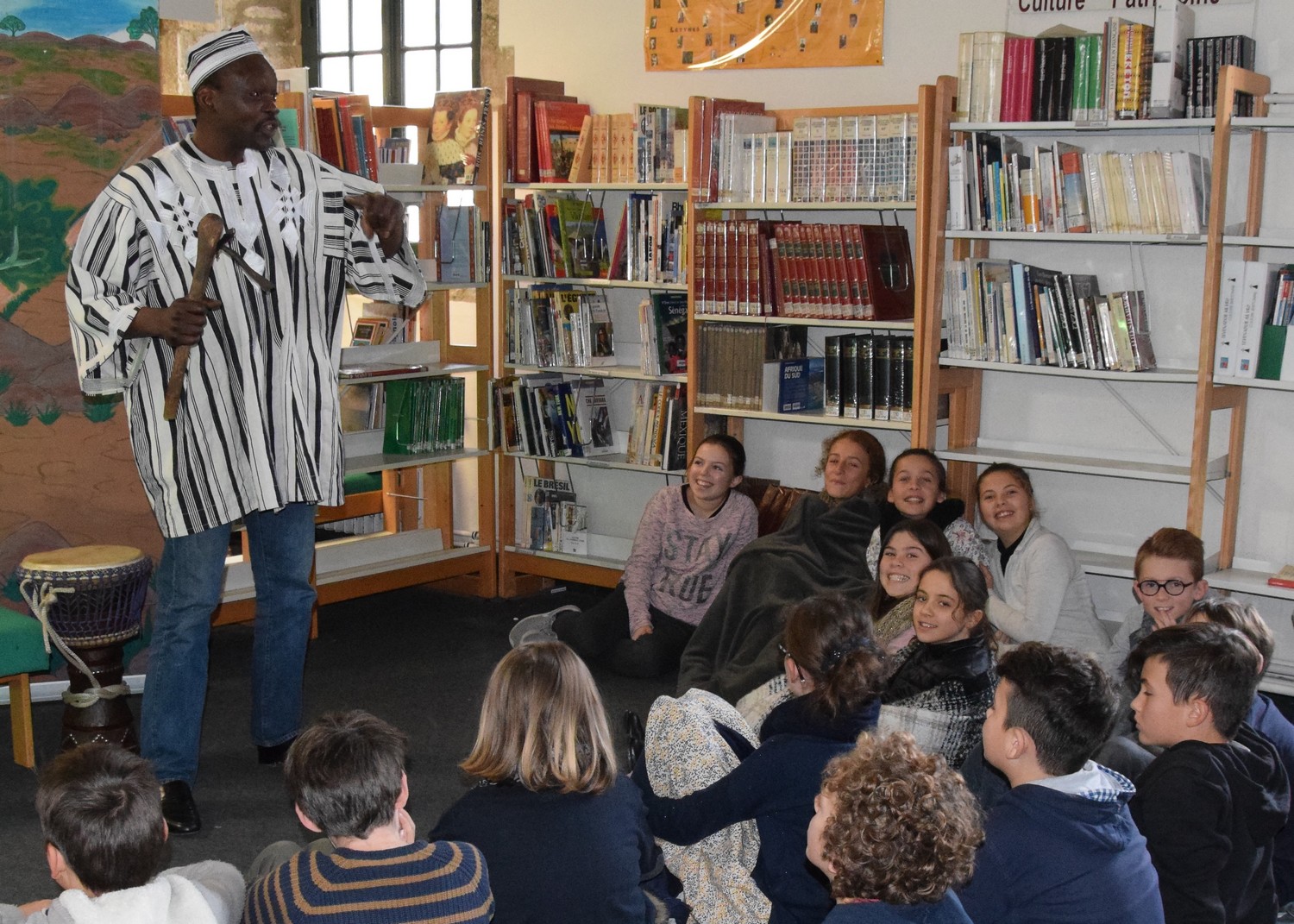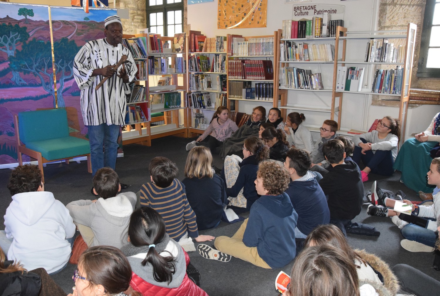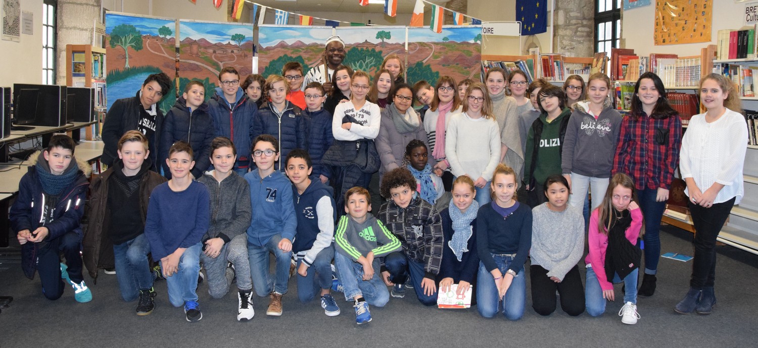 Le conteur Ismaël Gouba a été accueilli ce vendredi 2 décembre 2016 par les trois classes de 6ème au CDI des Cordeliers. Au cours du spectacle "Sagesses de la Savane" qu'il a joué pour les élèves, le conteur originaire du Burkina Faso a permis aux jeunes de s'évader dans l'imaginaire des villages africains, au travers de petites fables philosophiques dans lesquelles hommes et animaux cohabitent en bonne harmonie, et d'historiettes délurées aux chutes paraboliques que le conteur tient pour la plupart de son grand-père. Toute la magie de la tradition orale du conte africain a ainsi habité le CDI deux heures durant. Après cette transmission, la rencontre s'est terminée par un temps d'échange avec les élèves, qui repartent avec la ferme intention de coucher sur papier les histoires écoutées...
