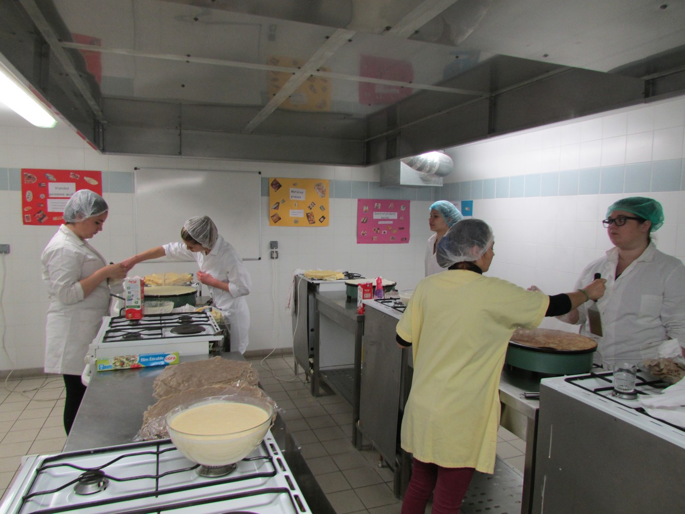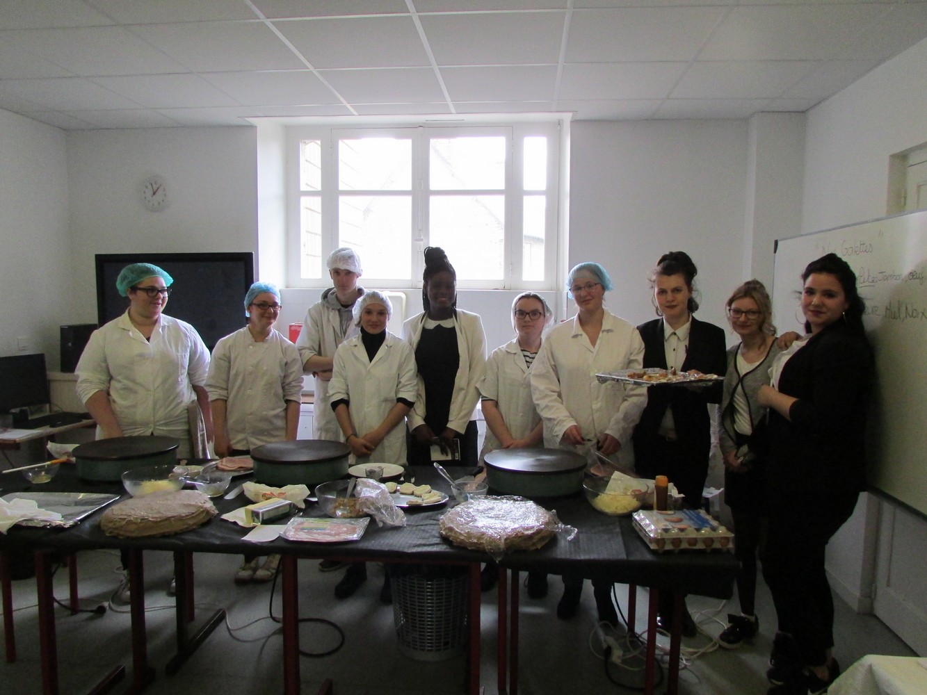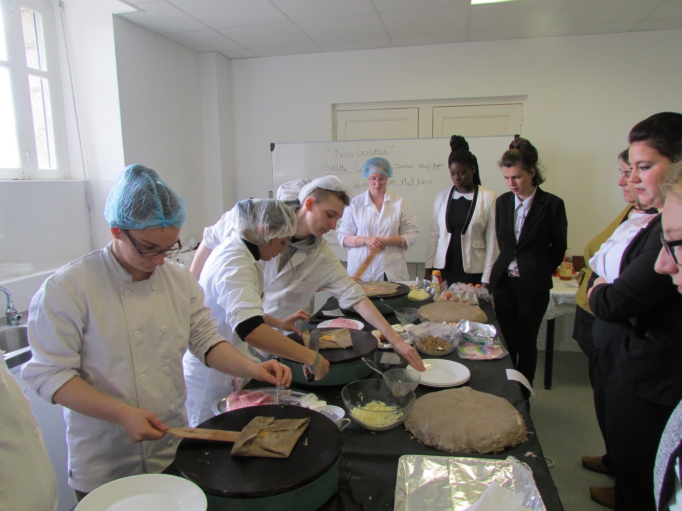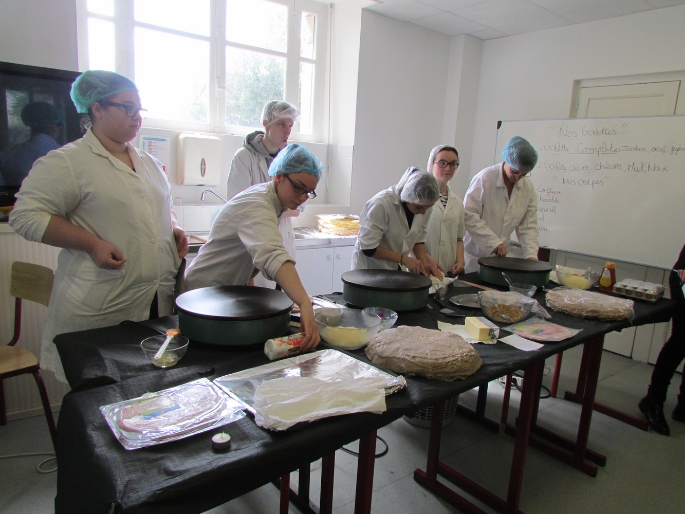 Les élèves de Terminale CAPa SAPVER (Services Aux Personnes et Vente en Espace Rural) du site Dominique Savio, dans le cadre de leur formation en MIP (Module d’initiative professionnelle) « la crêpe, notre patrimoine gastronomique », ont mis en pratique leur savoir acquis cette année par un stage d’une semaine en crêperie, la première semaine d’avril. Ensuite, les élèves ont été évalués par une épreuve certificative comptant pour leur examen final lors de la mise en place d’un repas pour le Conseil d’Administration de l’ensemble Scolaire les Cordeliers le 16 avril 2018. Les convives semblent avoir appréciés ce repas breton par leurs remarques à l’oral ou sur le livre d’or. Les élèves ont été évalués sur leur prestation en fonction de leur poste : Préparation en cuisine, préparation de la salle et de la décoration, la garniture finale des galettes et crêpes, le rangement. La journée s'est clôturée par un oral individuel afin d'établir un bilan de leurs activités.