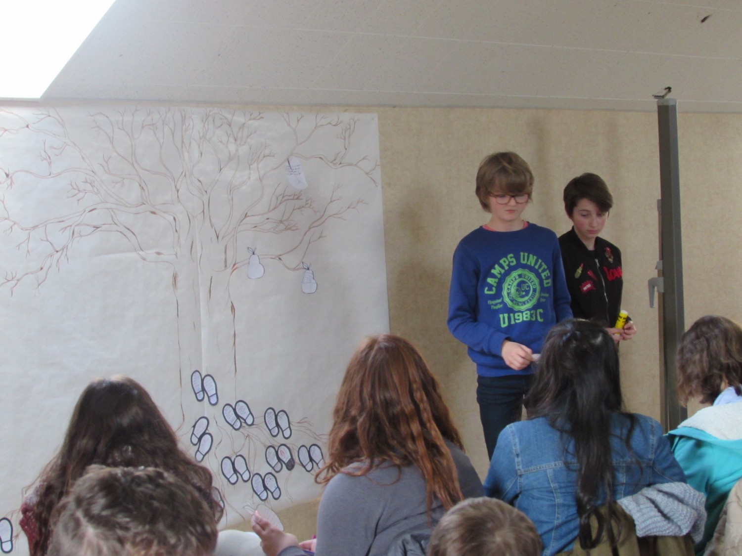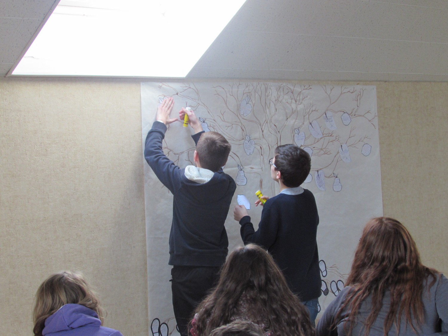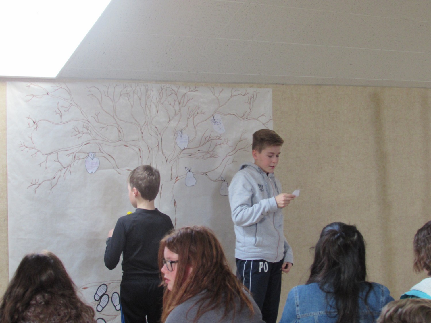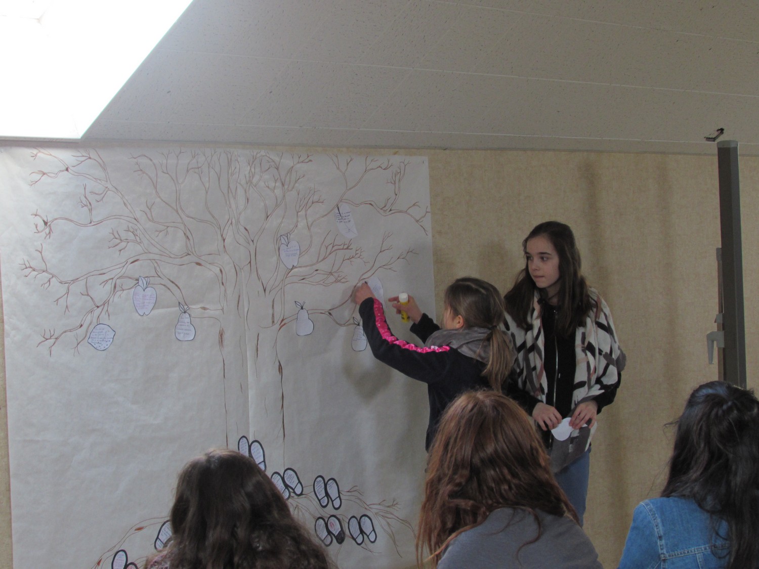 Le dernier moment de la journée fut consacré à la relecture en petits groupes et ensuite tous ensemble, ils ont partagé ce qu'ils ont vécu pendant ce temps fort, et ce qu'ils souhaitent par la suite, symbolisé par les fruits sur l'arbre.