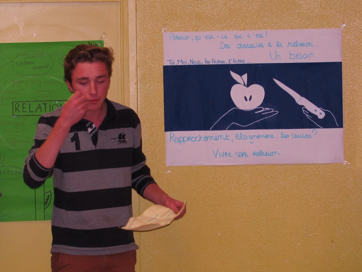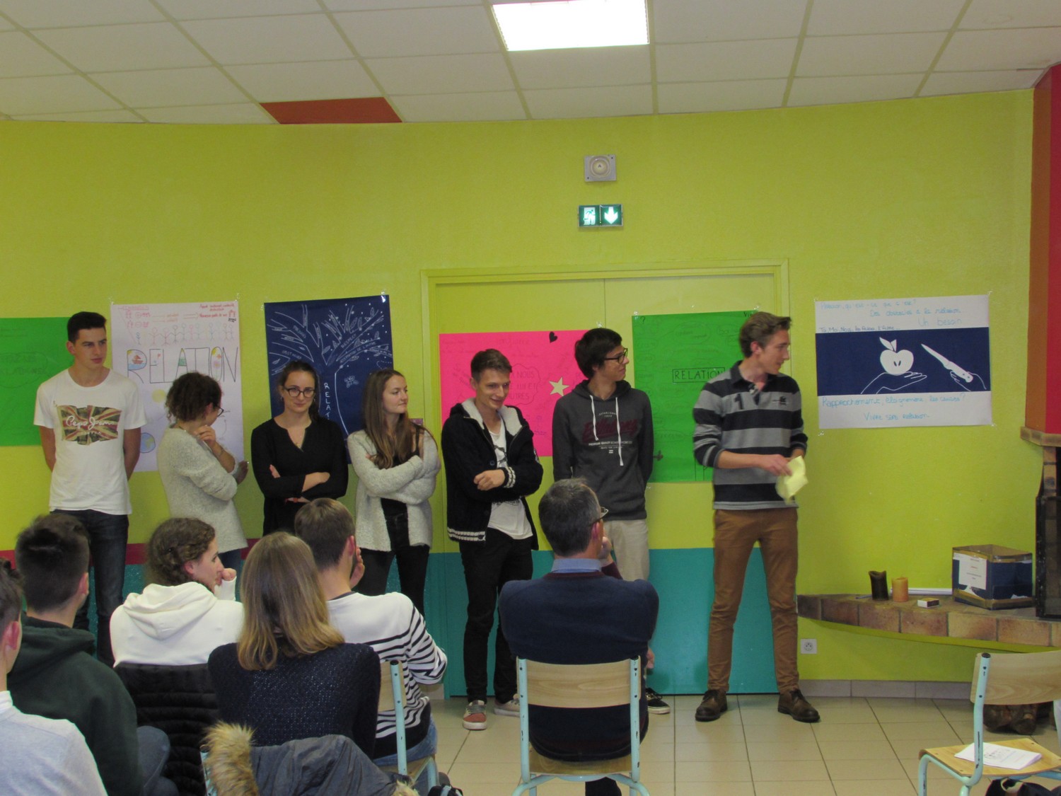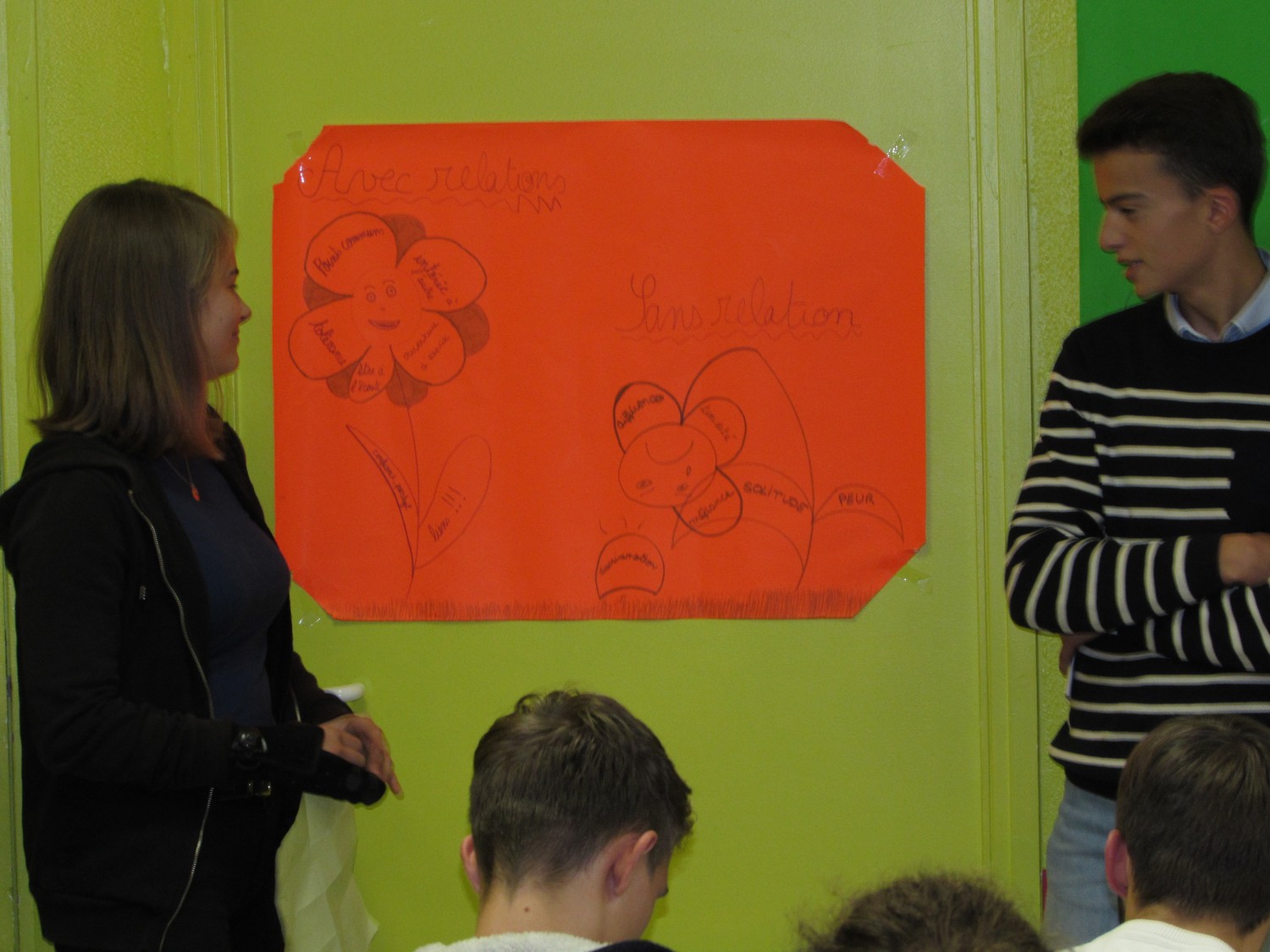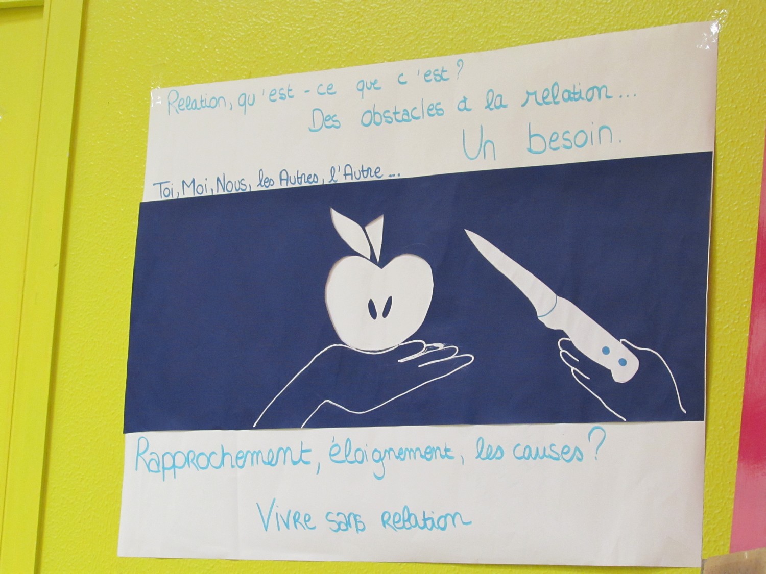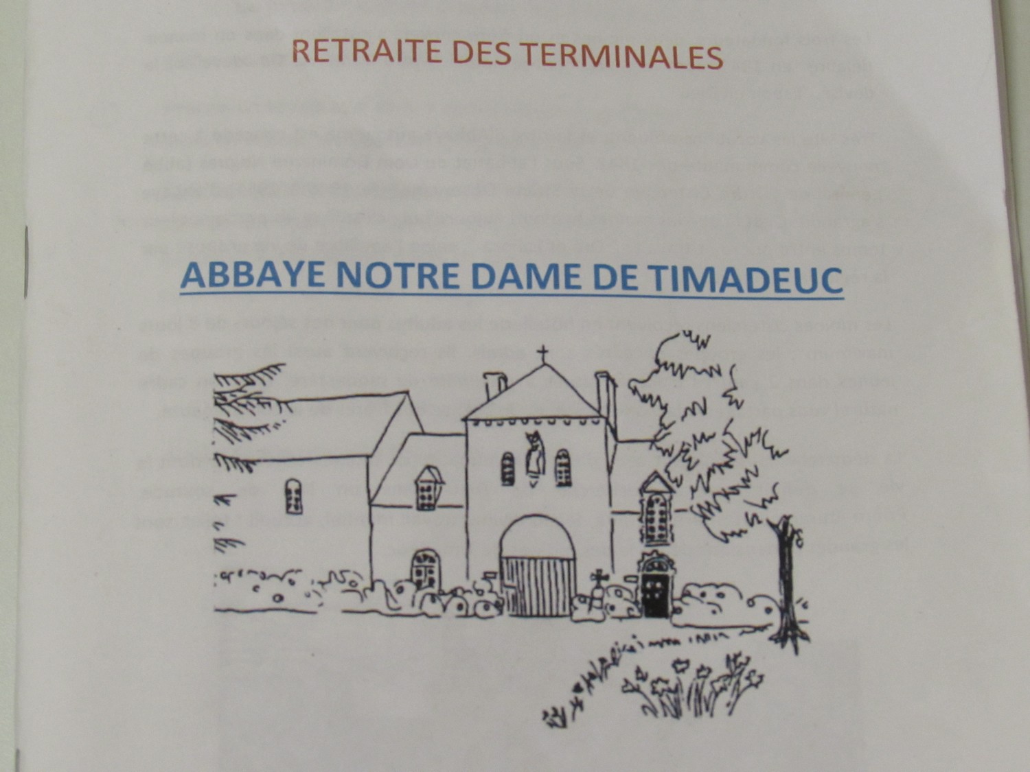 Les élèves ont réfléchi sur ce thème : « vivre les relations ». Ils étaient par équipe de 6 et ont ainsi élaboré un panneau. Suite au repas, à 19h30, ils ont pu assister aux complies des moines de Timadeuc. Impressionnant et impressionnés, les élèves se sont installés les uns après les autres au fond de l'église, en silence. Quant aux moines, ils sont arrivés dans le noir dans une ambiance « monacale ». Les chants retentissaient de manière profonde avec une puissance des mots qui l'était tout autant.