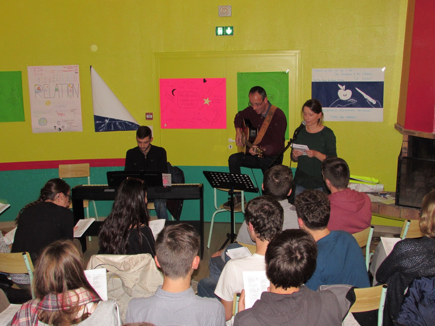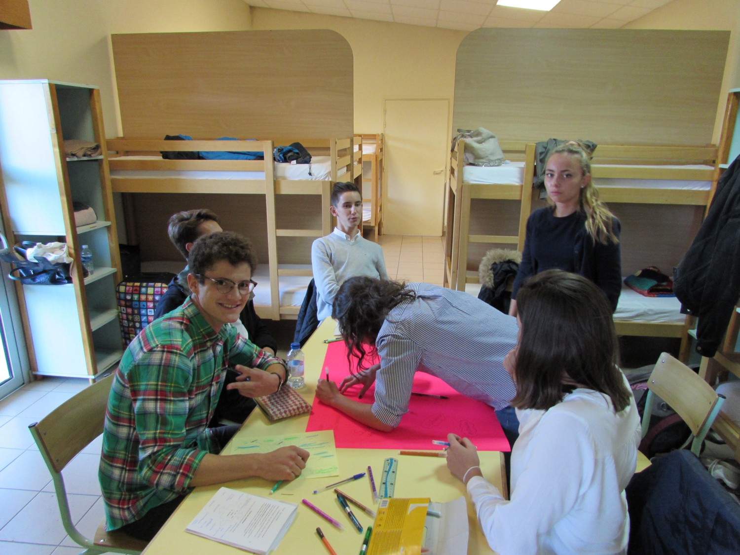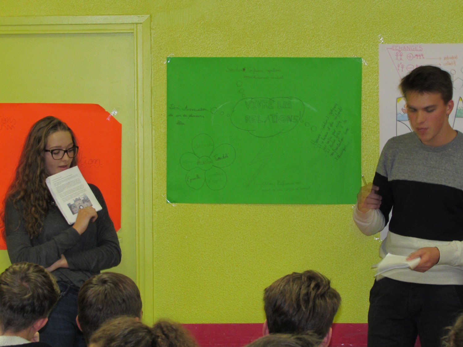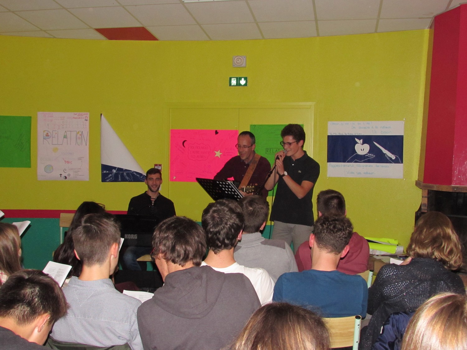 Les élèves ont réfléchi sur ce thème : « vivre les relations ». Ils étaient par équipe de 6 et ont ainsi élaboré un panneau. Suite au repas, à 19h30, ils ont pu assister aux complies des moines de Timadeuc. Impressionnant et impressionnés, les élèves se sont installés les uns après les autres au fond de l'église, en silence. Quant aux moines, ils sont arrivés dans le noir dans une ambiance « monacale ». Les chants retentissaient de manière profonde avec une puissance des mots qui l'était tout autant.