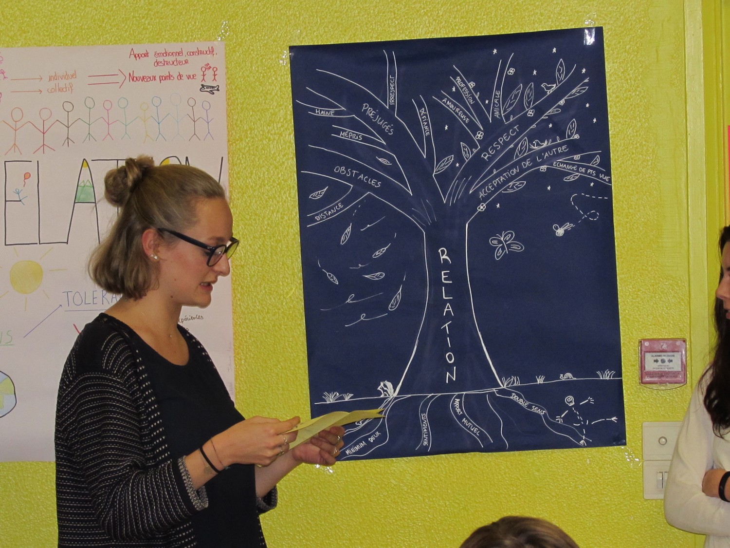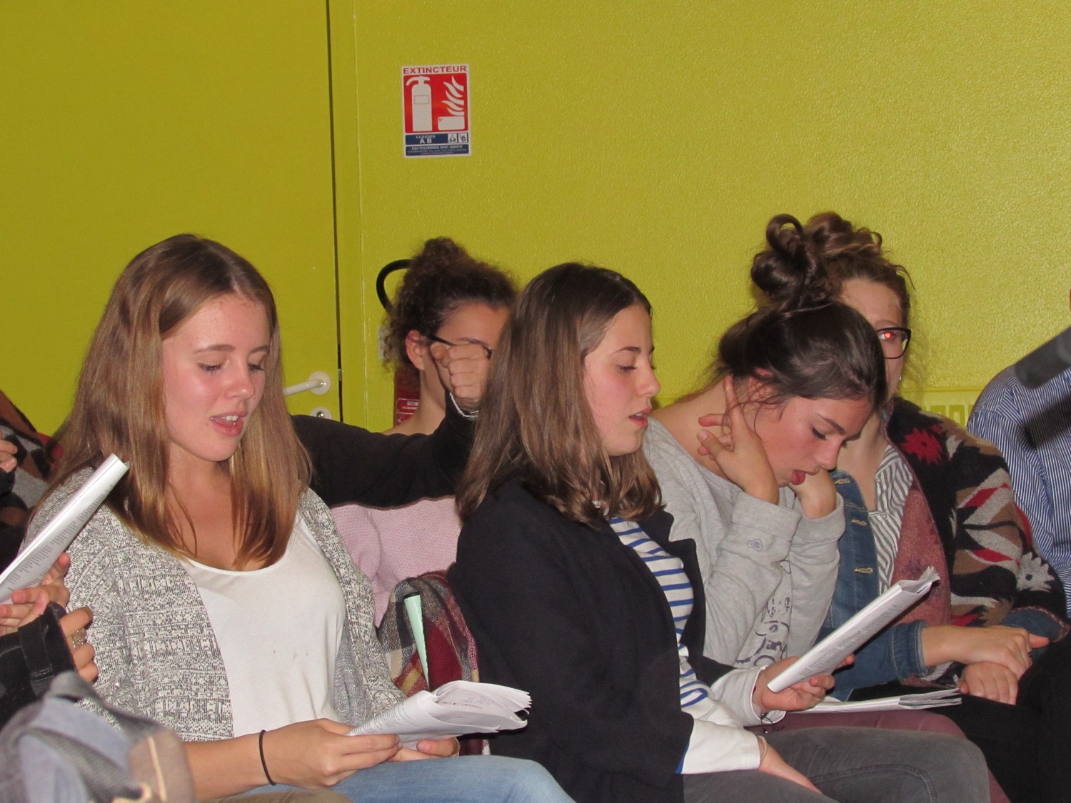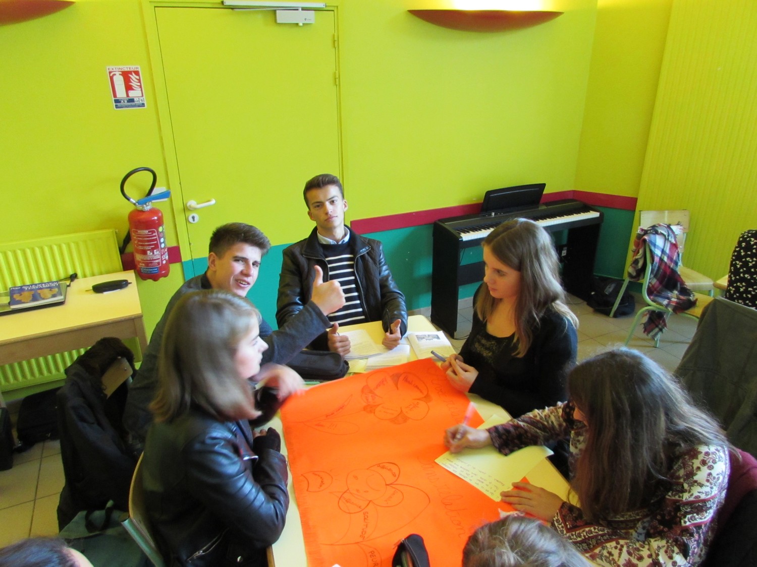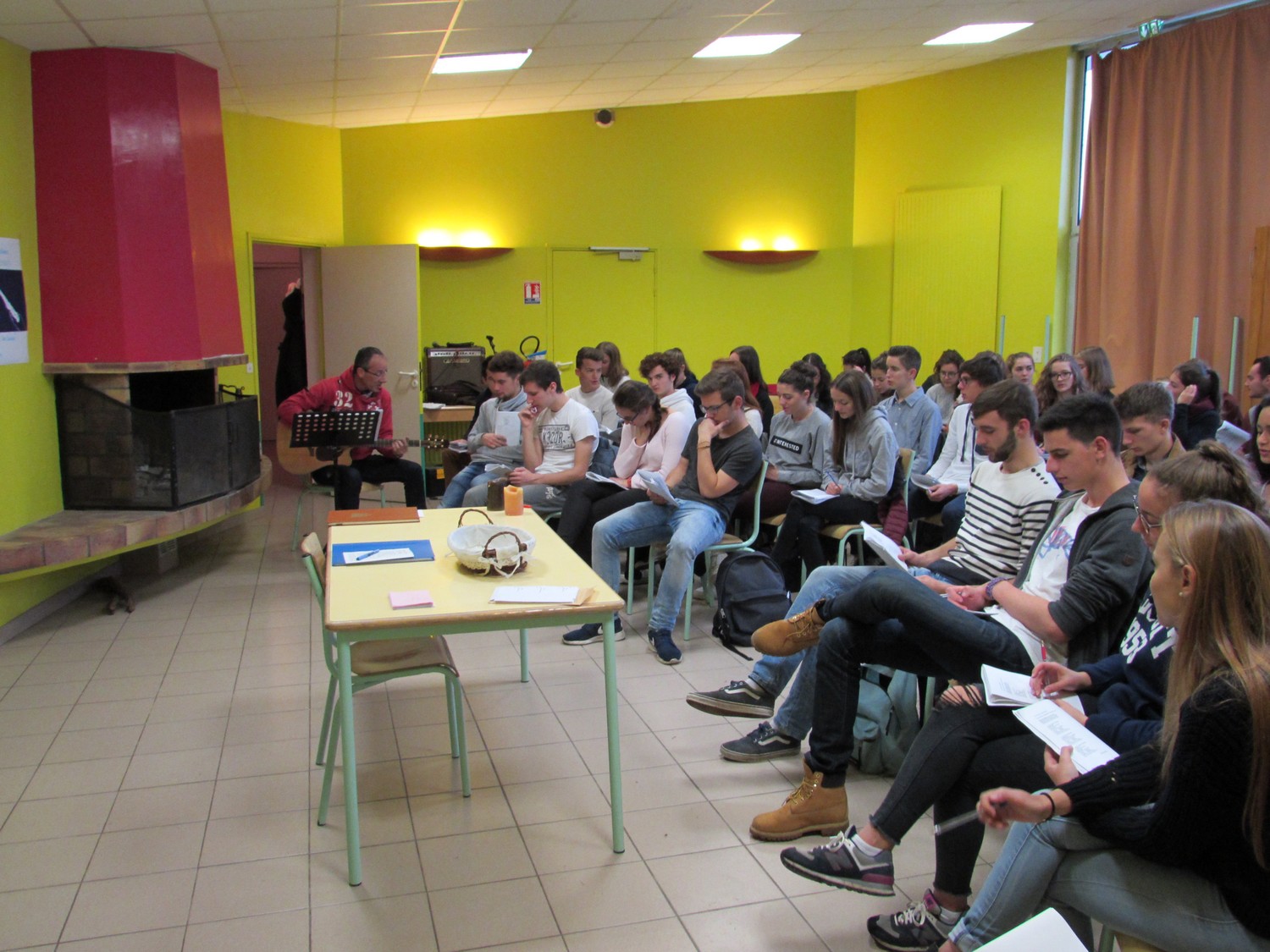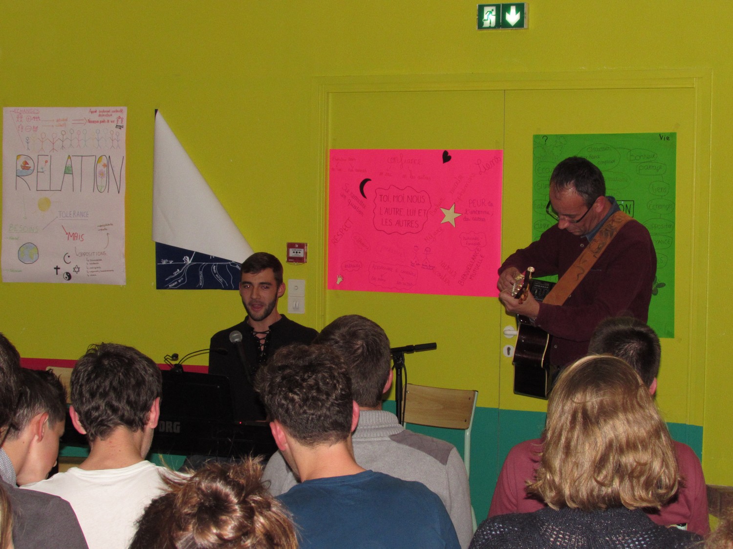 Les élèves ont réfléchi sur ce thème : « vivre les relations ». Ils étaient par équipe de 6 et ont ainsi élaboré un panneau. Suite au repas, à 19h30, ils ont pu assister aux complies des moines de Timadeuc. Impressionnant et impressionnés, les élèves se sont installés les uns après les autres au fond de l'église, en silence. Quant aux moines, ils sont arrivés dans le noir dans une ambiance « monacale ». Les chants retentissaient de manière profonde avec une puissance des mots qui l'était tout autant.