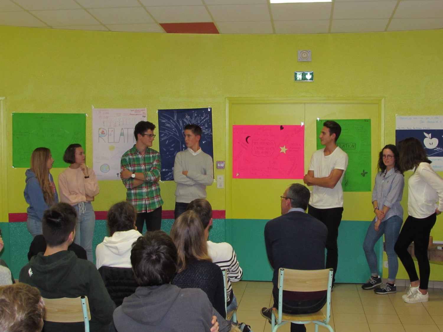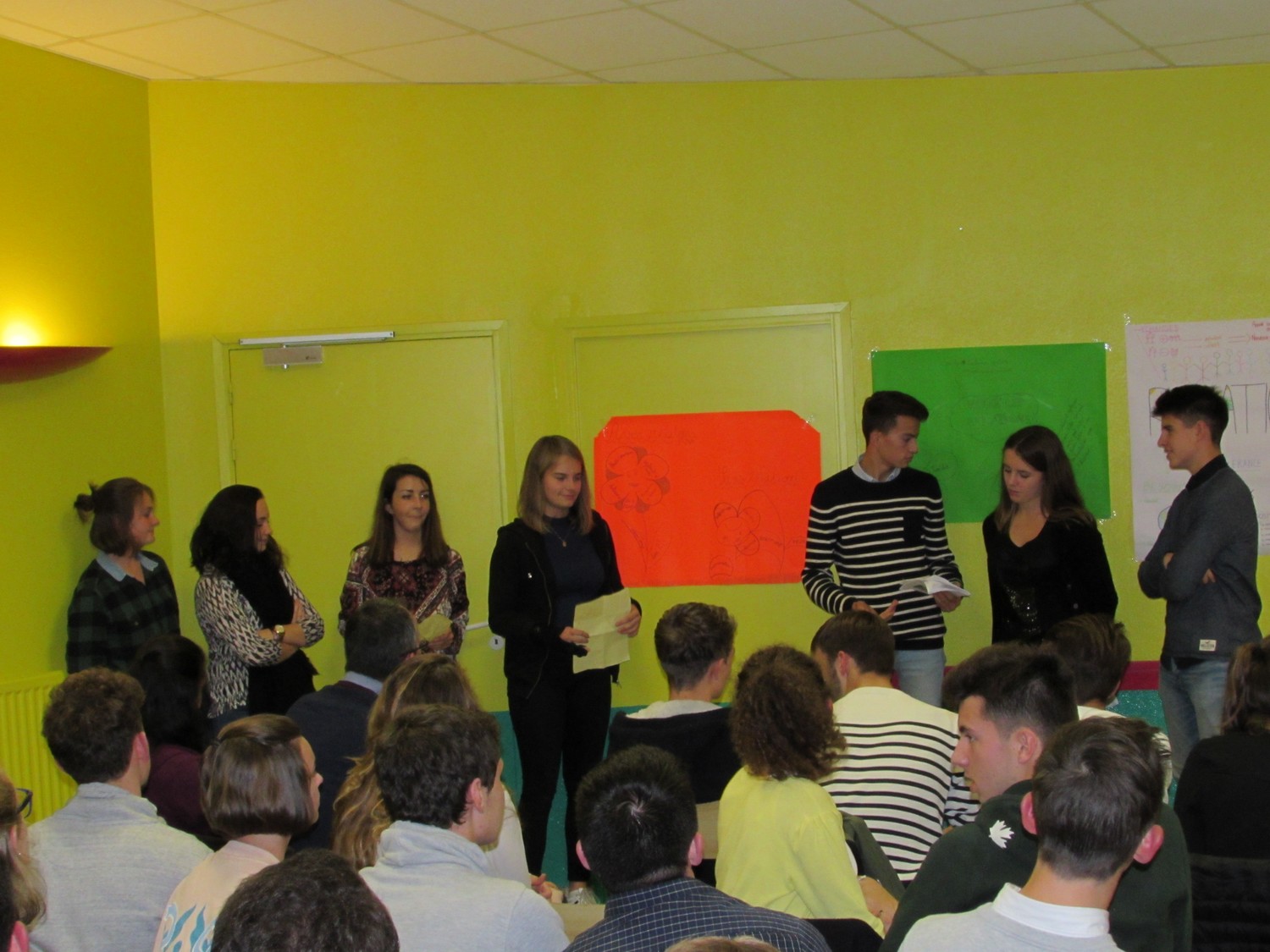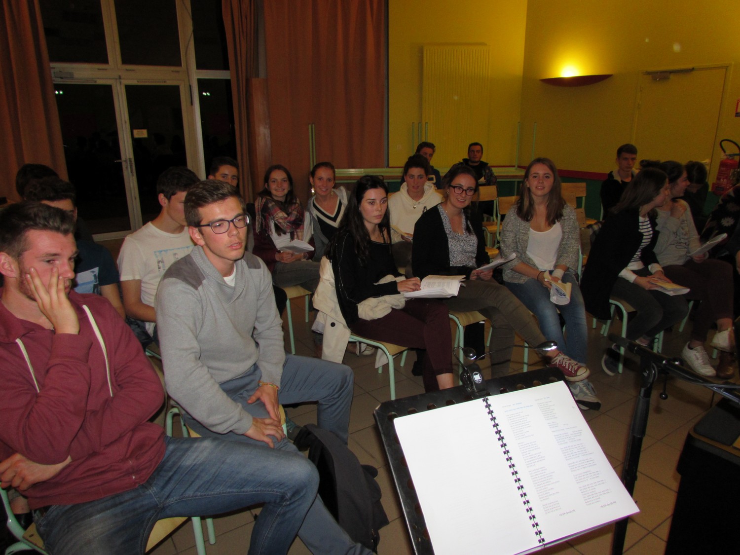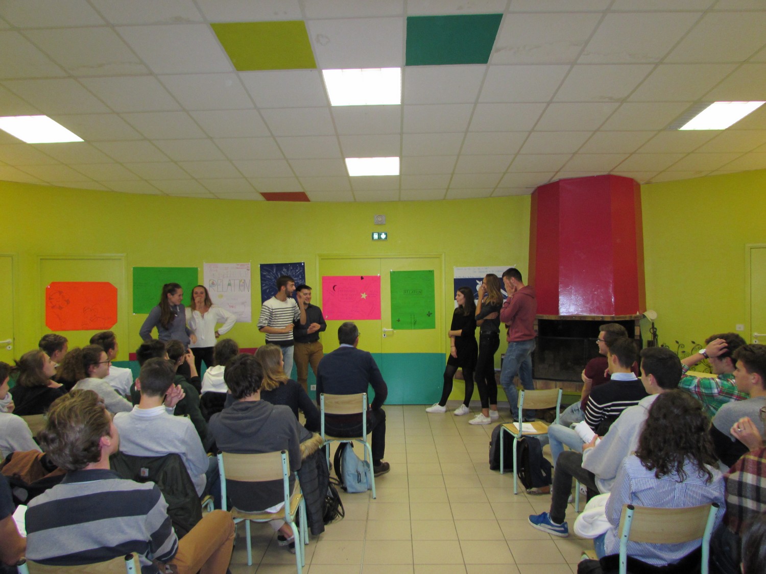 Les élèves ont présenté en fin de soirée les panneaux propres à chaque équipe récapitulant leurs idées. Les messages étaient forts, les expressions très différentes mais chaque groupe avait déjà trouvé sa propre identité. François les a interrogé sur le sens des mots choisis par chaque groupe, les idées véhiculées, le « sens » propre à chacun, le « pourquoi » de tel ou tel mot... Le Père Jean est quant à lui intervenu en reprenant le sens de la vie, de leur vie, le sens de la prière, de l'engagement, de la jeunesse...