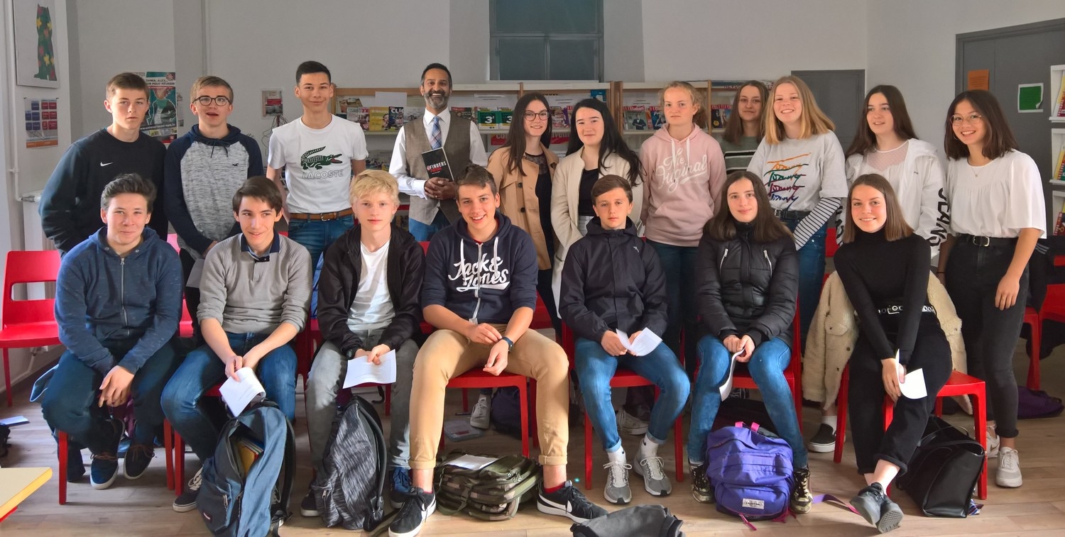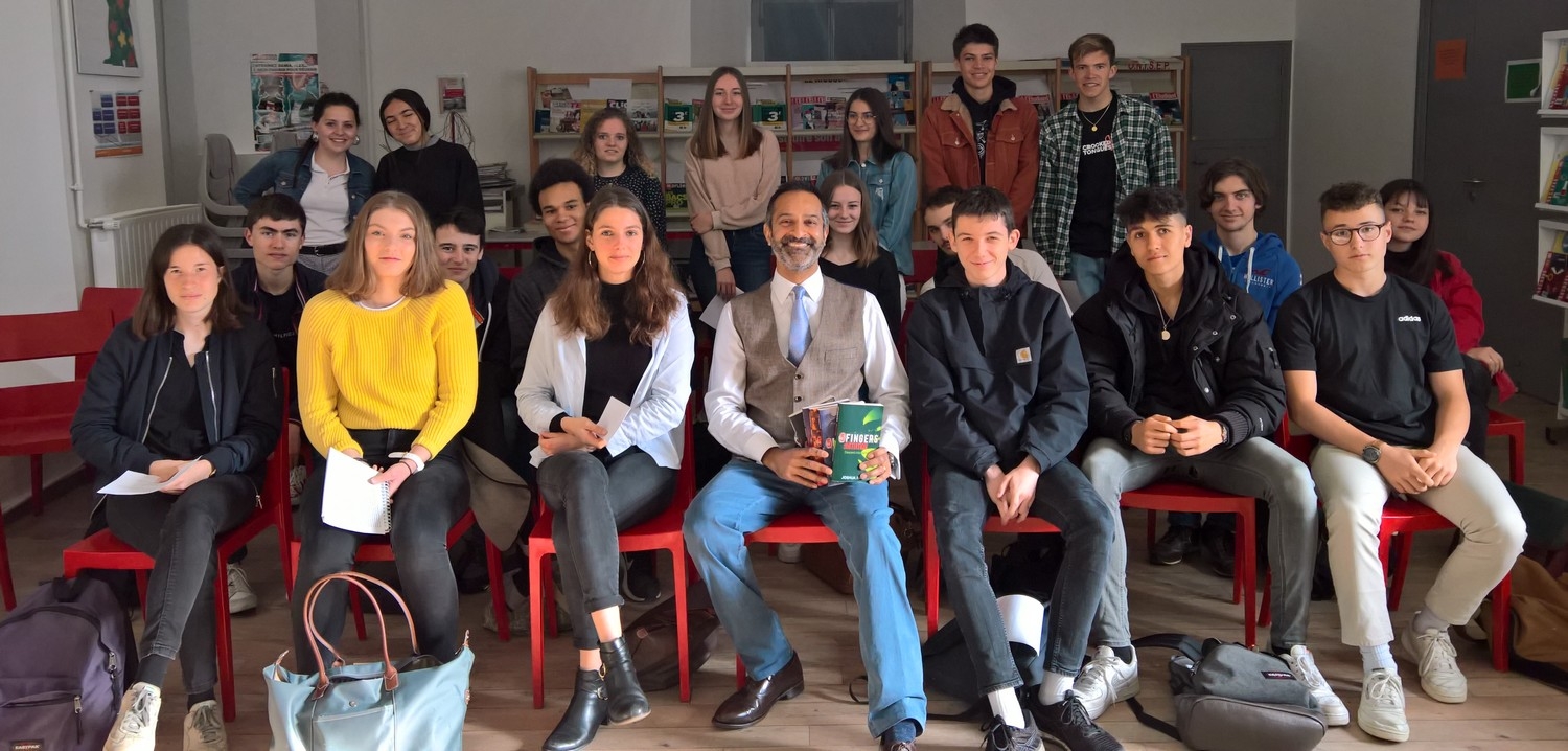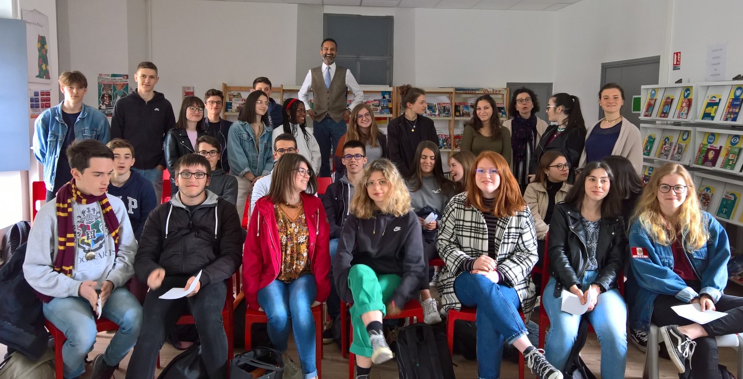 Pour la sortie de son 5ème livre dans la série fantastique « 5 Fingers », Joshua Raven est venu rencontrer les élèves des Cordeliers. Les cent soixante élèves des sections européennes de 3ème, 2nde, et 1ère ont pu lui poser des questions sur ses livres, sa vie, sa façon d'écrire et échanger pendant une heure en anglais. Certains ont aussi participé à un atelier d'écriture et se sont essayés à de courts poèmes ou histoires de six mots ou plus.