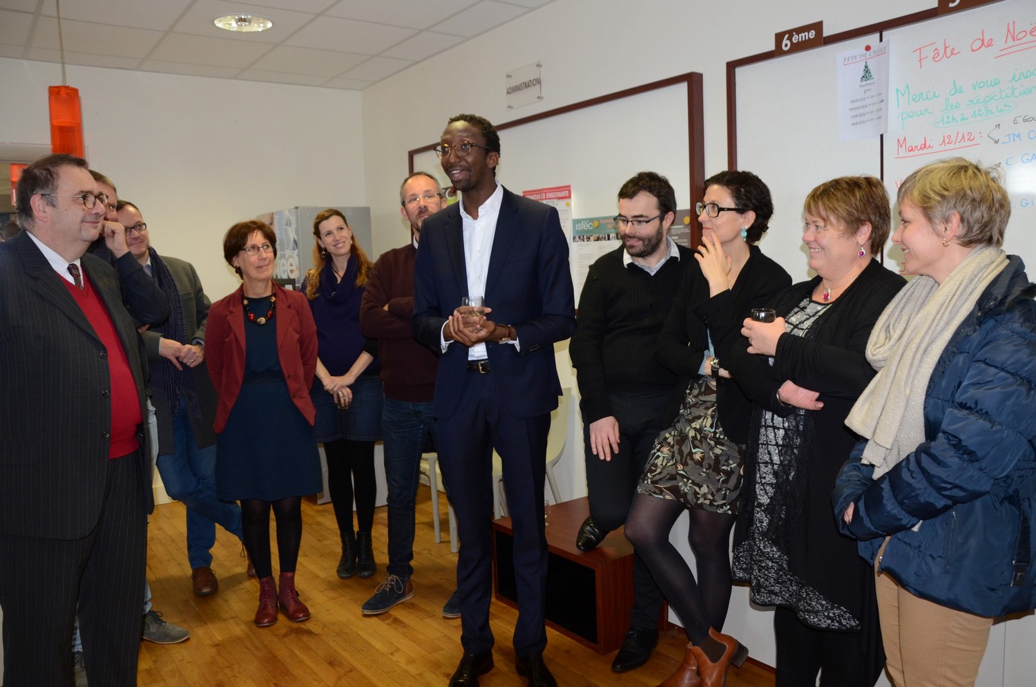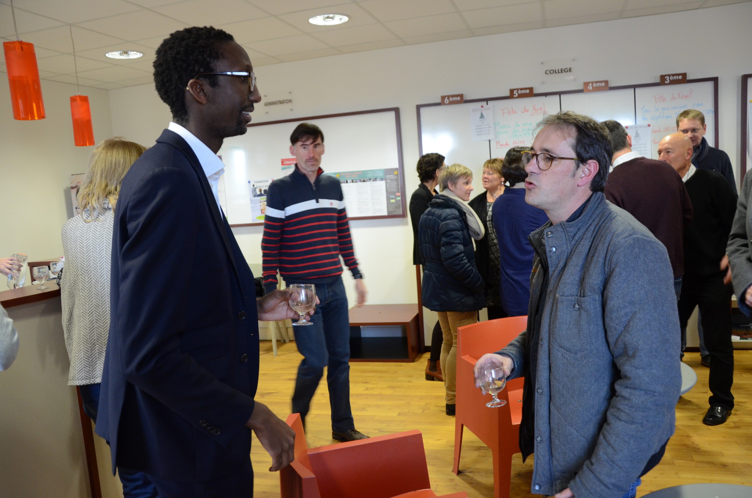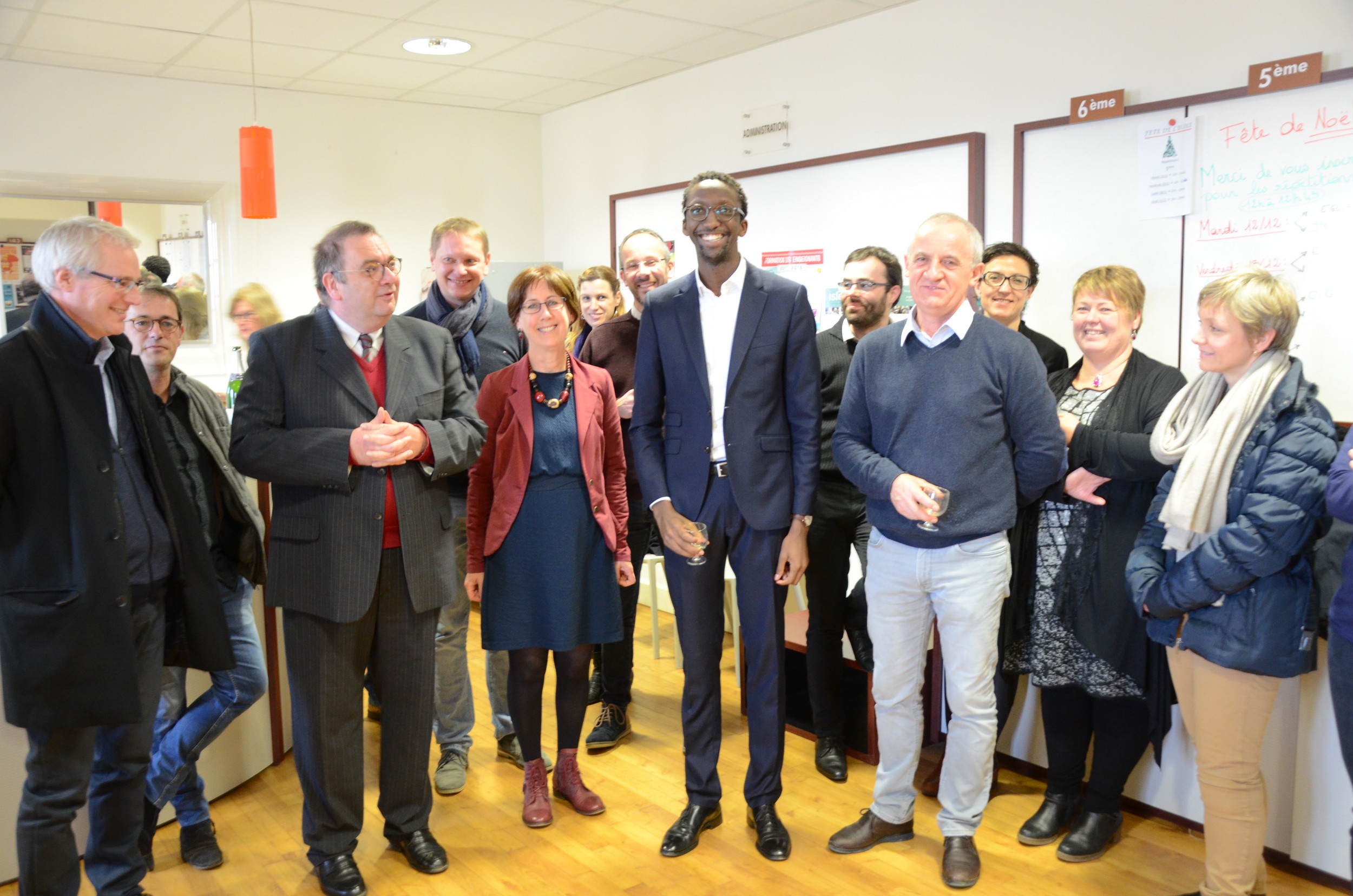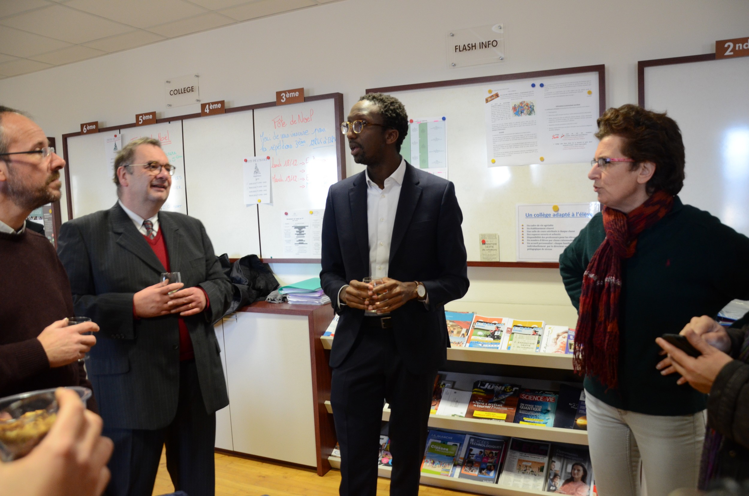 Il a été élève au collège de la Victoire de septembre 2001 à juin 2005, puis après une année de seconde au lycée Saint-Joseph à Lamballe, il est revenu à Dinan au lycée des Cordeliers pour y effectuer sa première et terminale S où il a obtenu son bac en 2008. Depuis, il n’avait pas remis les pieds au lycée. Mais entre-temps, il a été élu député de la circonscription de Dinan. C’était en juin dernier dans la foulée de l’élection du président de la République d’Emmanuel Macron, dont il est l’un des premiers soutiens. Hervé Berville, 27 ans, était invité lundi 18 décembre par le directeur M. Gerbel à rencontrer quelques-uns de ses anciens professeurs. L’échange s’est fait de manière assez informelle sur le coup de midi à la salle des professeurs. « C’est un vrai moment d’émotion » a dit le jeune député à ceux qui l’ont accueilli. « J’ai trouvé ici des professeurs qui m’ont fait grandir et qui m’ont permis de devenir ce que je suis. ». Le moment particulièrement chaleureux s’est poursuivi par le repas au cours duquel l’échange a été plus direct cette fois sur la question de la réforme du lycée et de l’enseignement supérieur. En quittant l’établissement, Hervé Berville a rencontré des élèves en classe d’anglais avec leur professeur M. Jouffe, un ancien camarade de lycée.