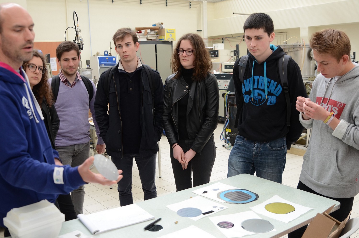 Les dix élèves de la spécialité physique-chimie de Terminale S, ont suivi tout un après-midi, le vendredi 27 avril, le travail d’Olivier de Sagazan, ingénieur de recherche, physicien, au chevet de ces plaques de silicium sur lesquelles devaient apparaître, les microcircuits visibles, in fine, au microscope électronique.